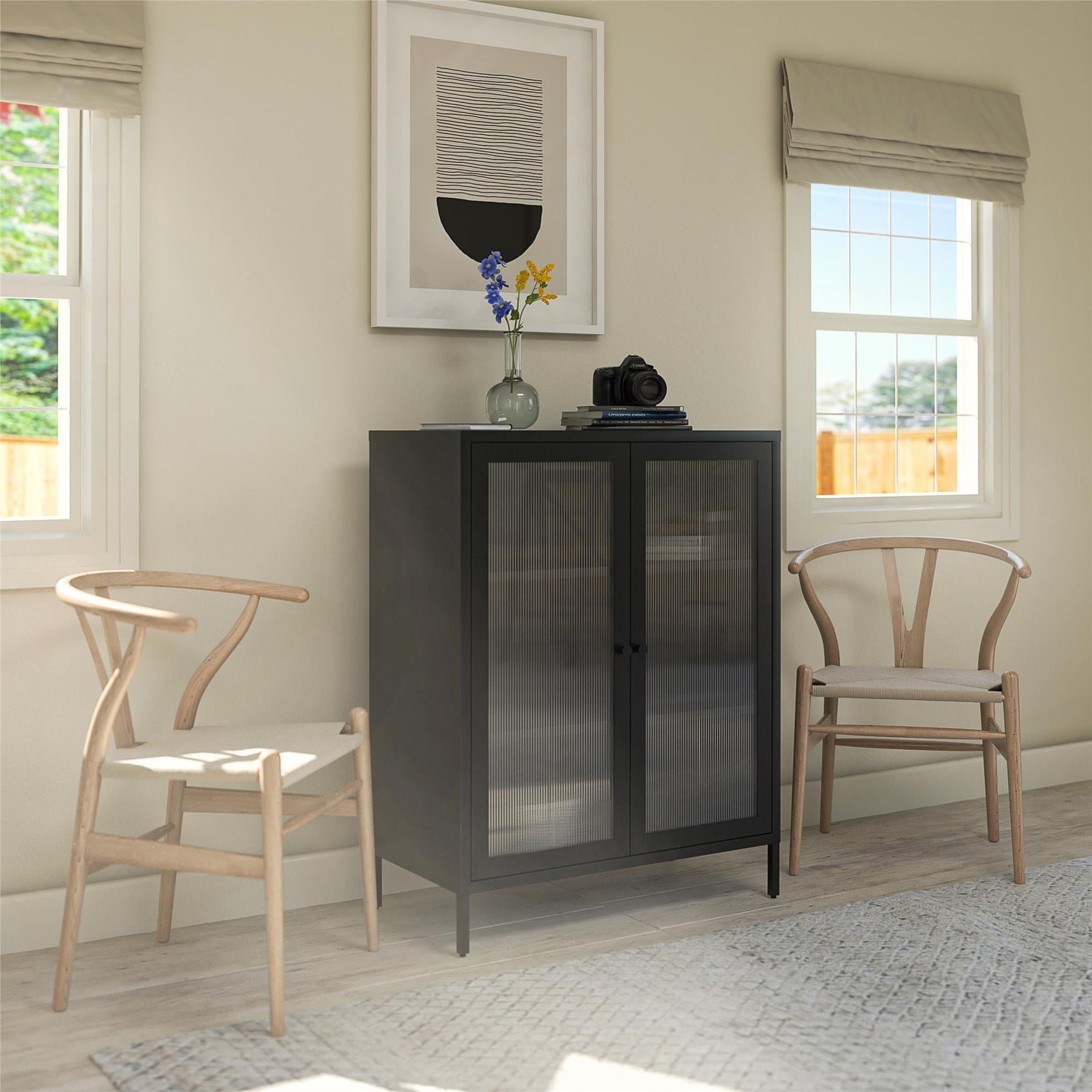 Upgrade your storage solutions with the chic and functional Ameriwood Home Ashbury Heights Utility Cabinet. This black, steel freestanding unit features fluted glass doors that add a touch of elegance to any room. Perfect for both style and utility, the cabinet offers versatile storage options with its adjustable shelving, accommodating various needs from the living room to the bathroom.