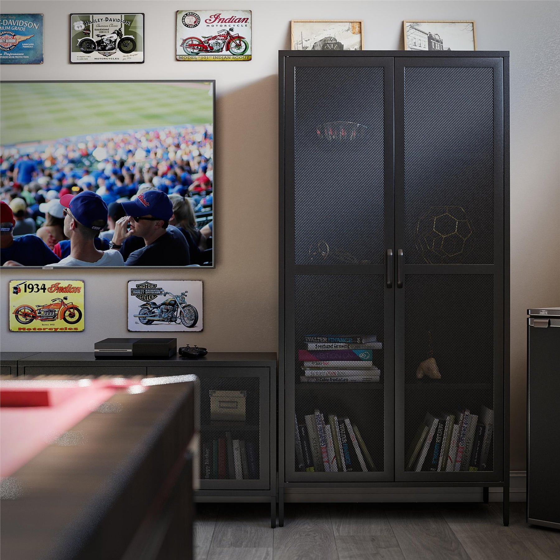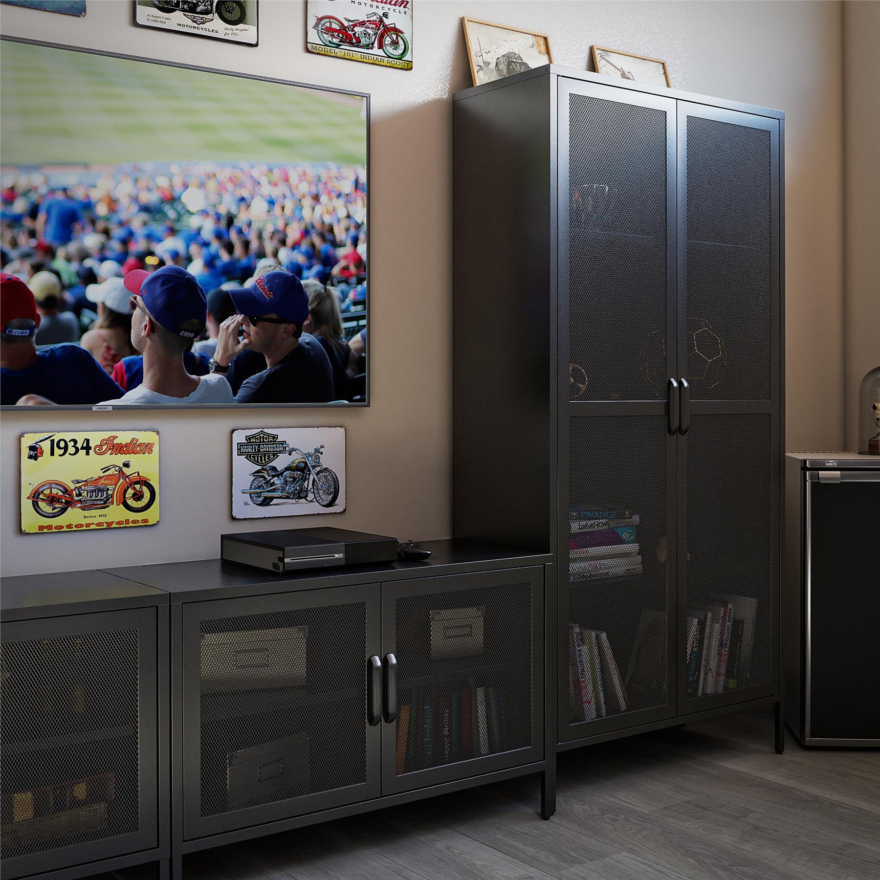 The Ameriwood Home Sunset District Utility Cabinet transforms any room with its industrial chic style, reminiscent of contemporary urban lofts. Its standout mesh doors offer a modern take on classic metal storage, subtly showcasing your most prized possessions or daily essentials. Place it in your den to store cherished books or blanket throws and elevate your interior's sophistication. Embrace this piece for its functionality and consider it an essential element in crafting an aspirational, organized living space.