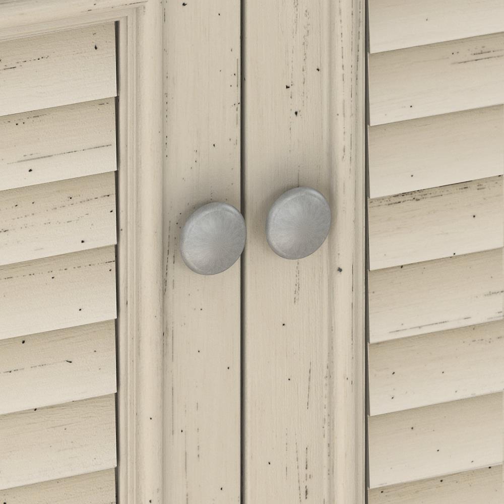 The Fairview Antique White Storage Cabinet is a versatile organizing solution with a charming modern farmhouse aesthetic and durable build. Featuring louvered doors, antique pewter hardware, and adjustable shelving, it's perfect for optimizing space in your home or office.