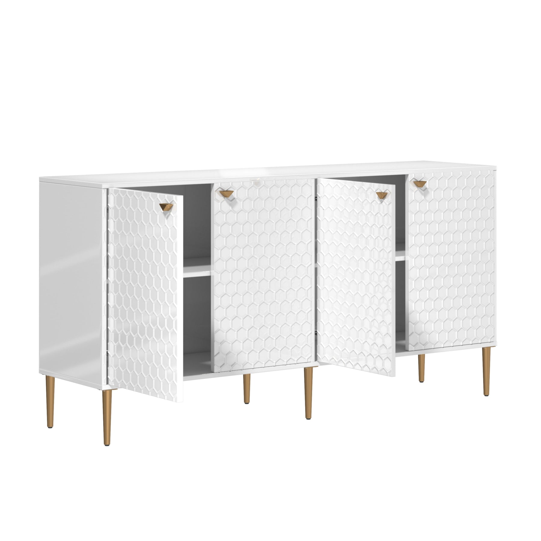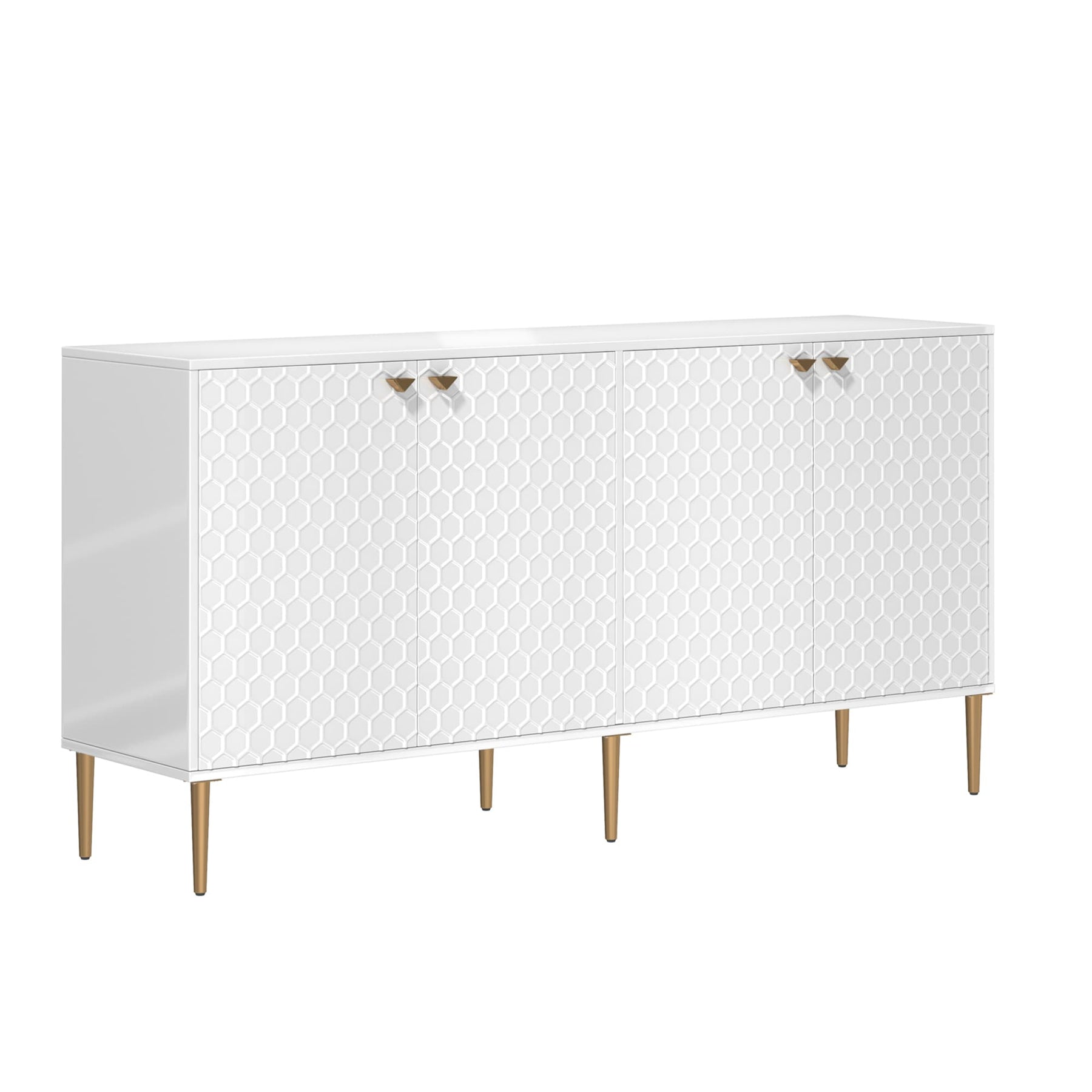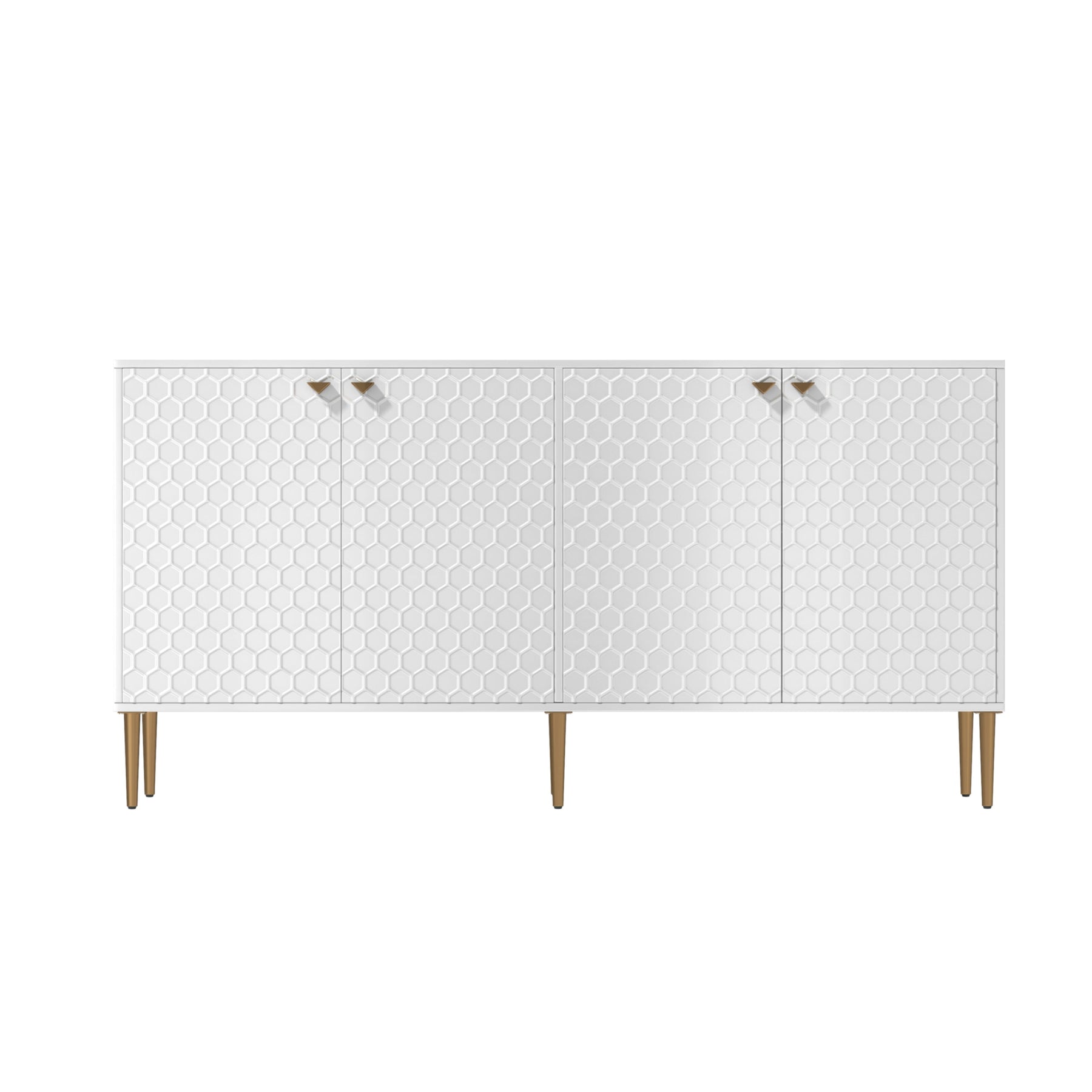 Elevate your space with this chic white freestanding utility cabinet. Featuring gold-colored metal legs and handles, and a sophisticated honeycomb embossed design, this MDF-crafted cabinet offers both style and functionality for any room.