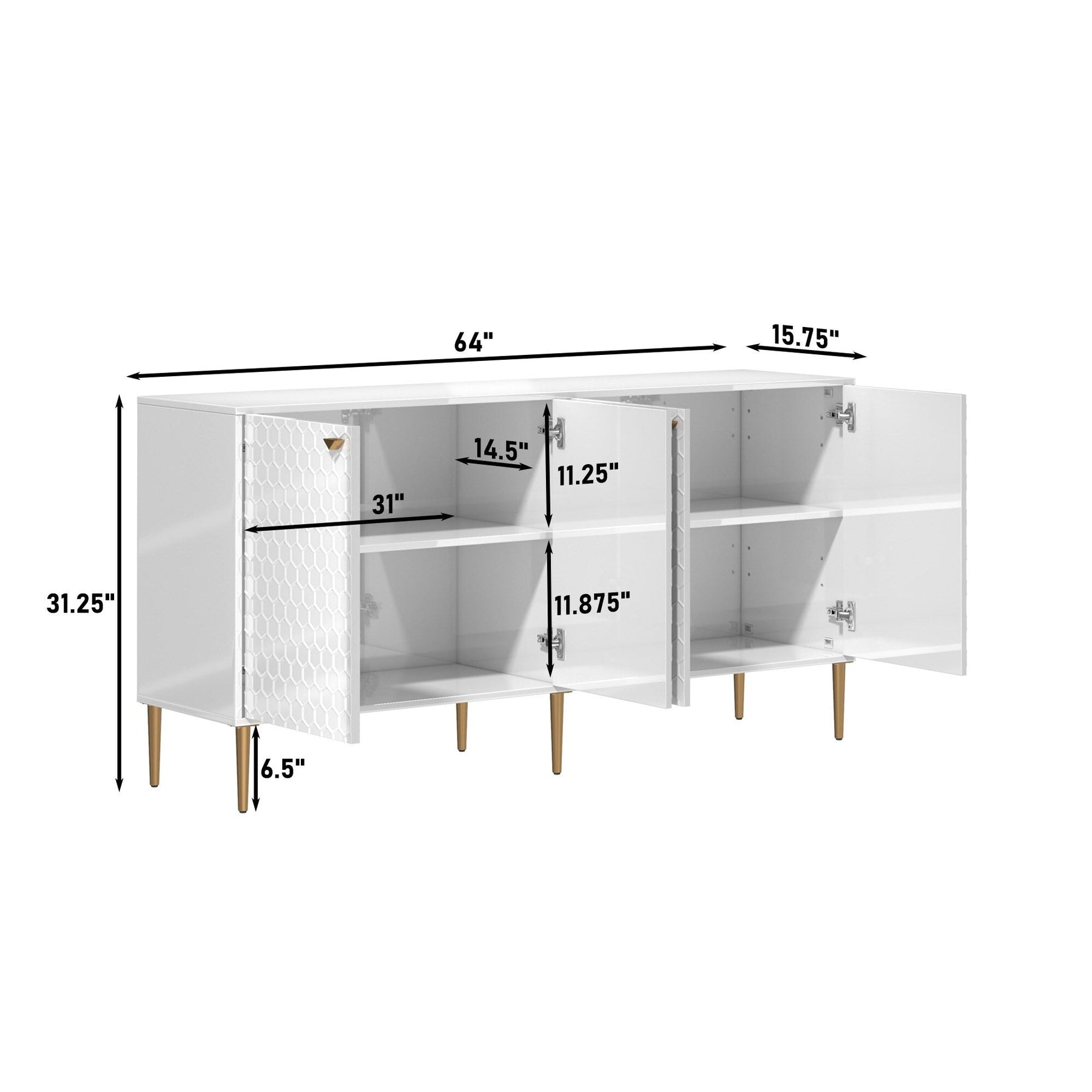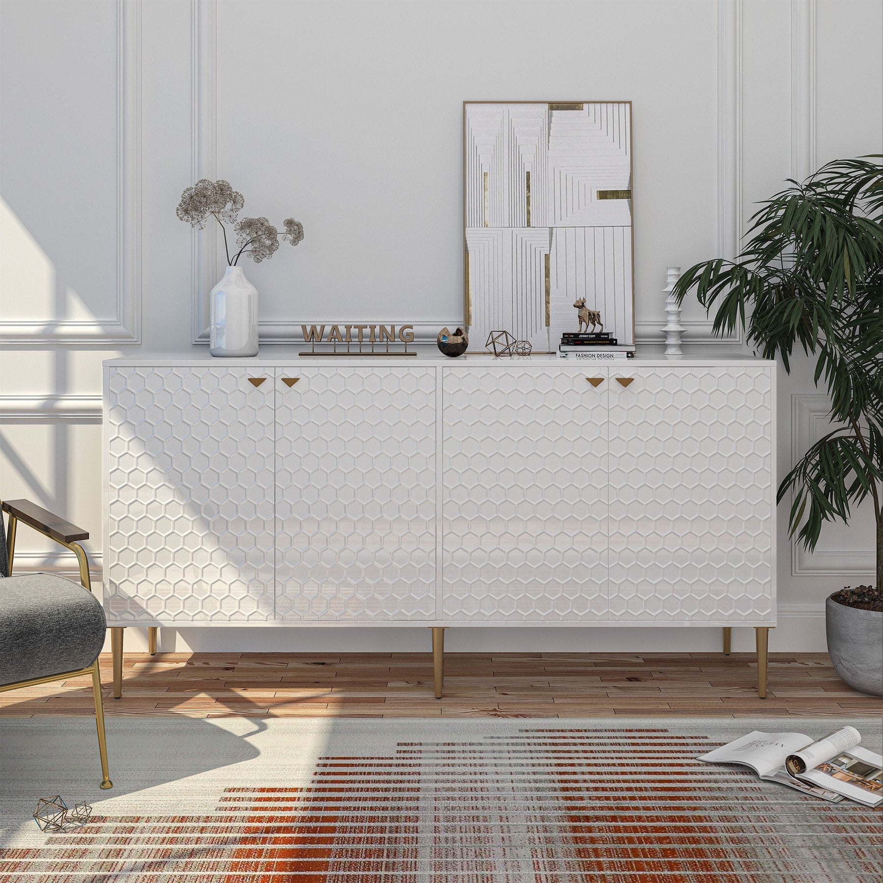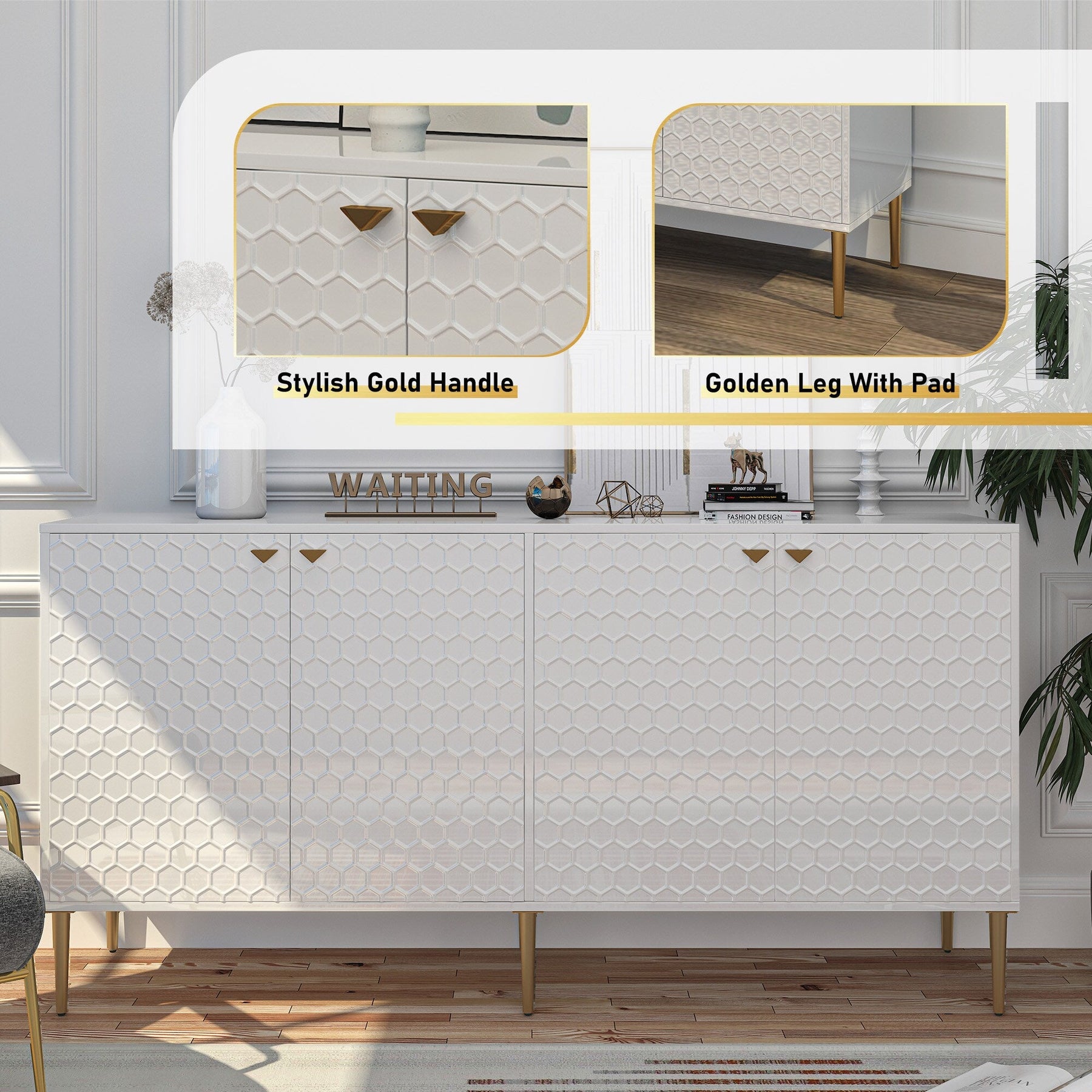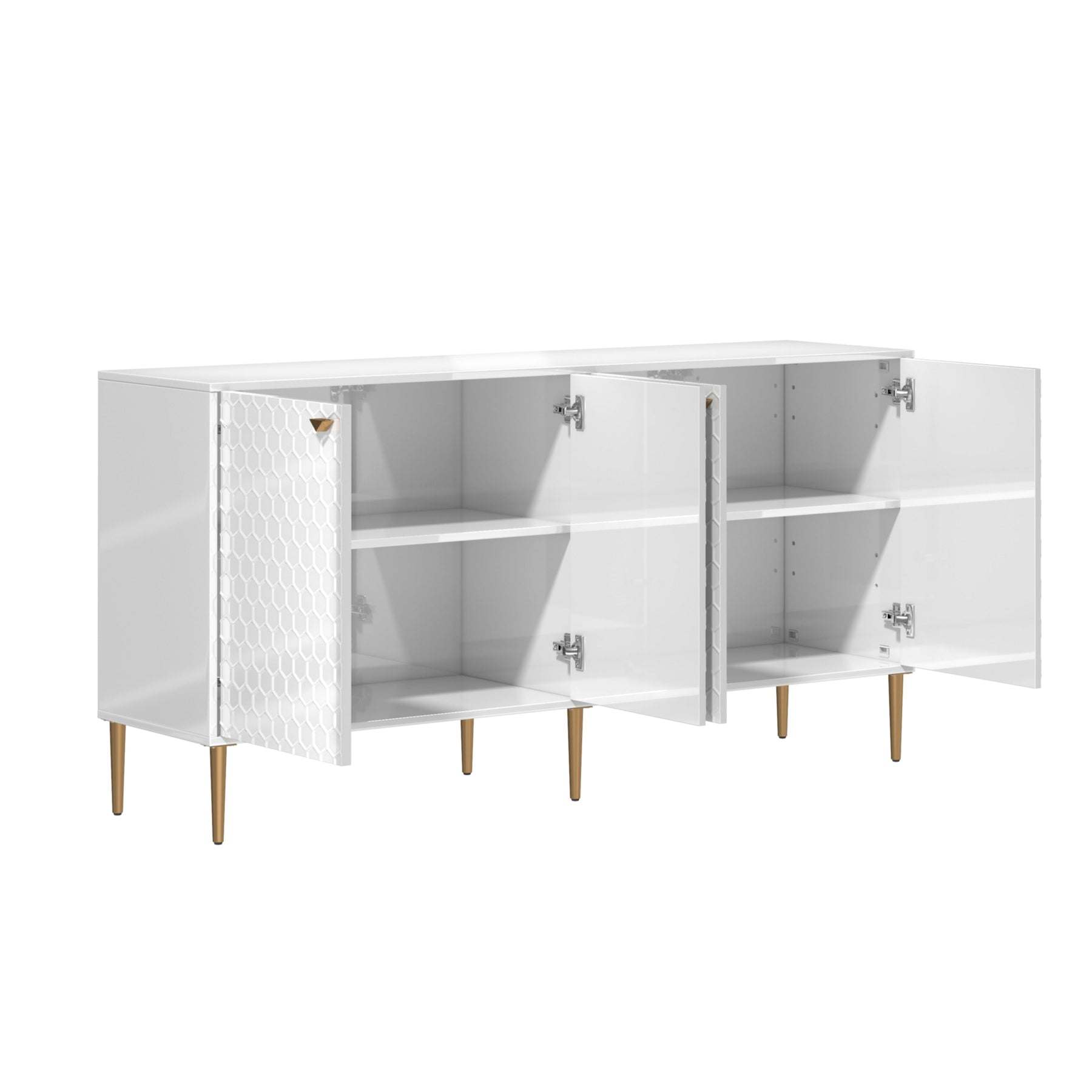 Elevate your space with this chic white freestanding utility cabinet. Featuring gold-colored metal legs and handles, and a sophisticated honeycomb embossed design, this MDF-crafted cabinet offers both style and functionality for any room.