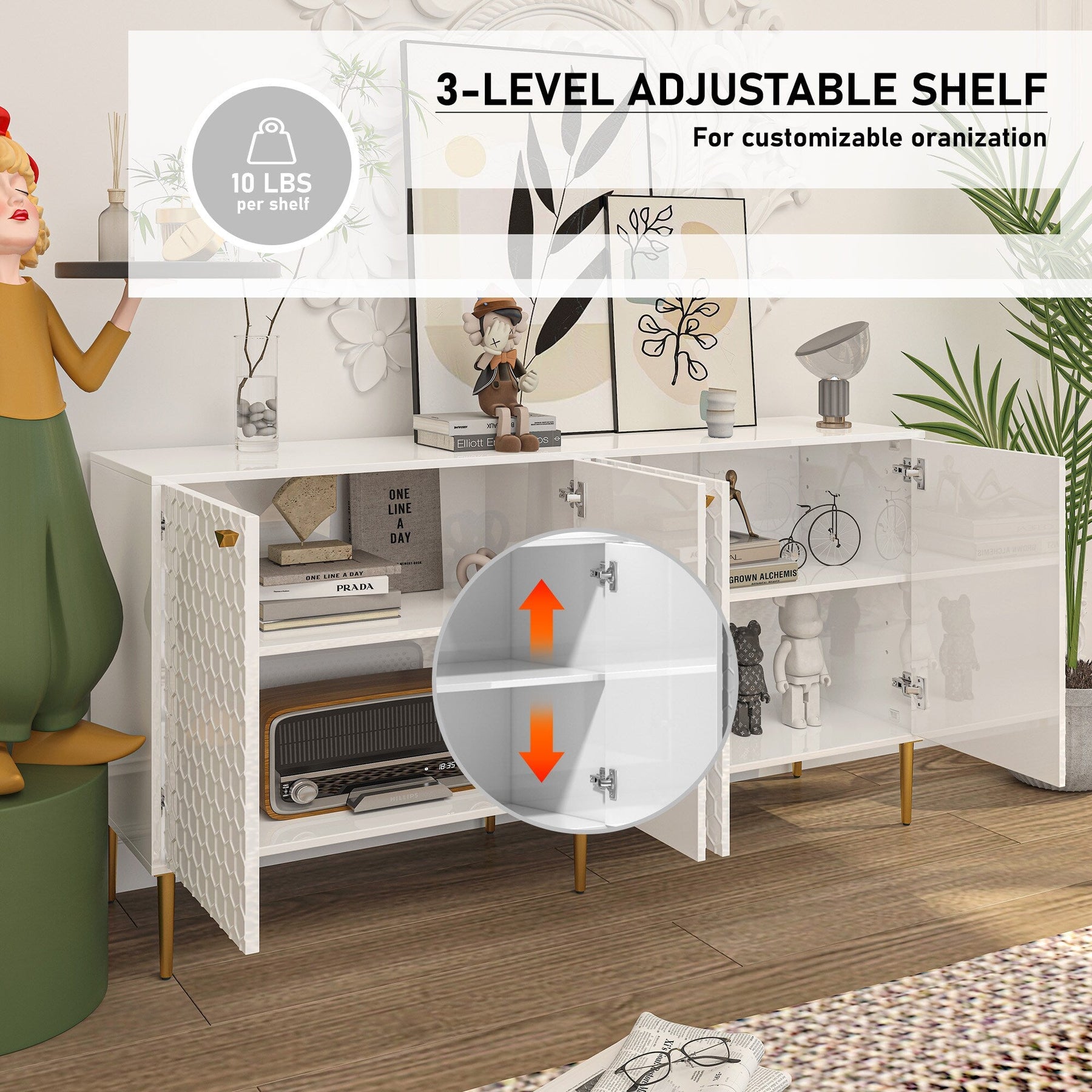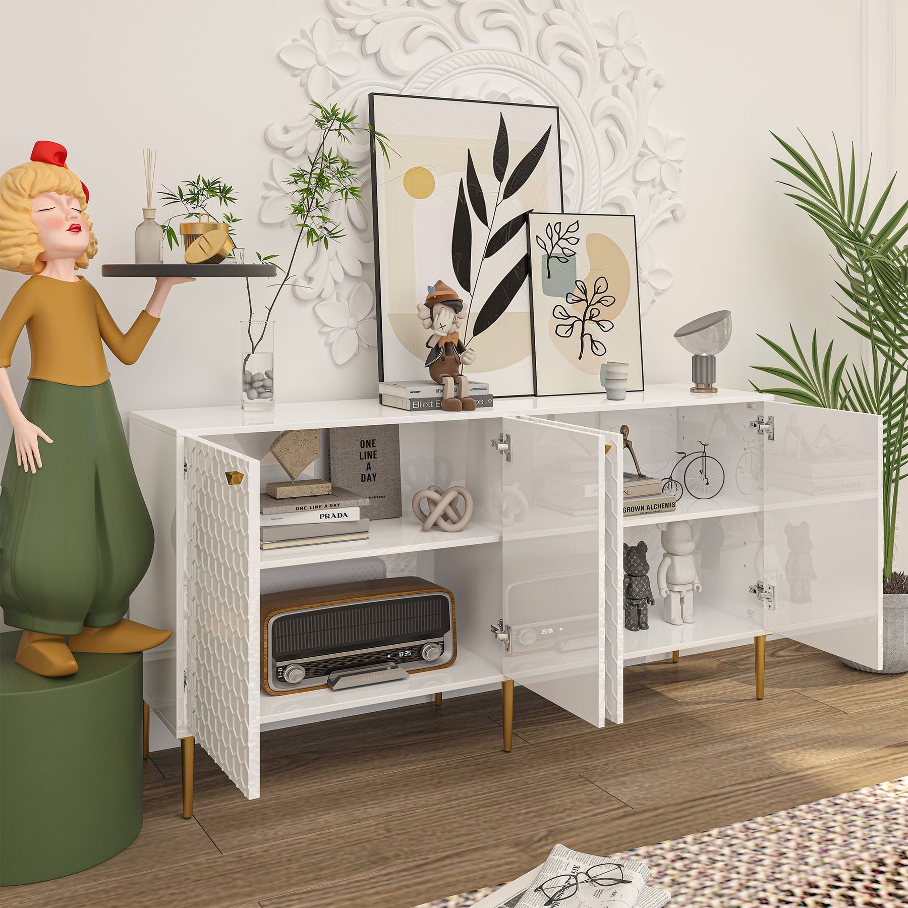 Transform your living space with this exquisite storage cabinet, a testament to luxurious minimalism. The gilded handles and tapered metal legs exude a sophisticated flair, adding a modern touch to its seamless white finish. Picture this piece adorned with art books and a sleek table lamp to craft an elegant focal point in any room. Truly an indispensable addition for those who treasure both aesthetics and utility in their homes.