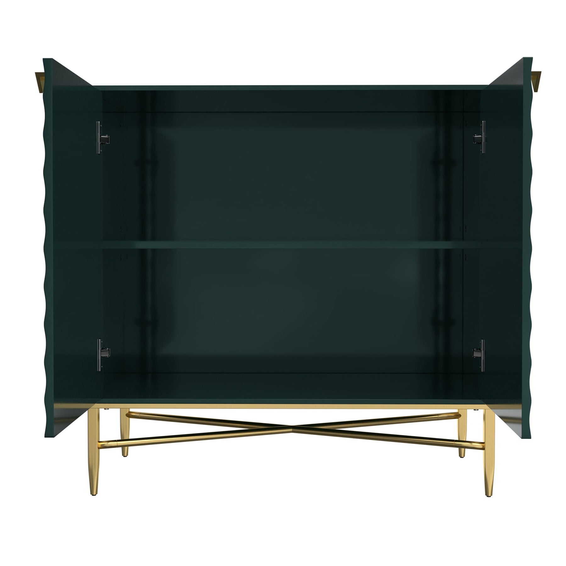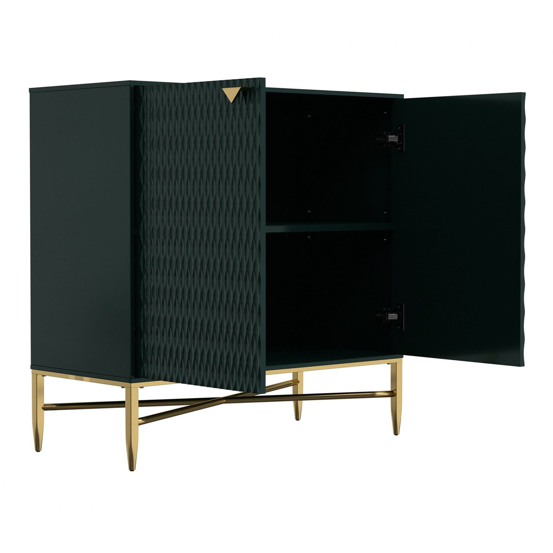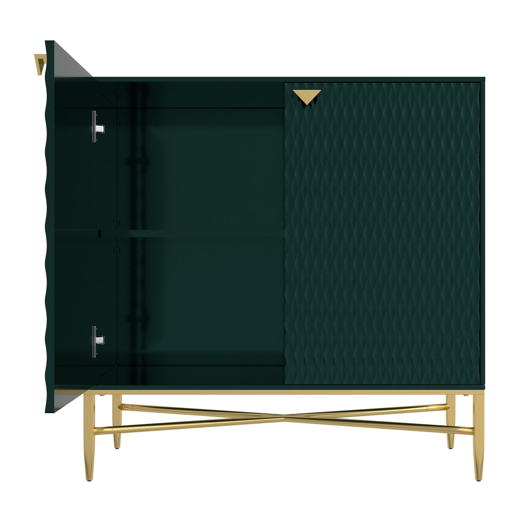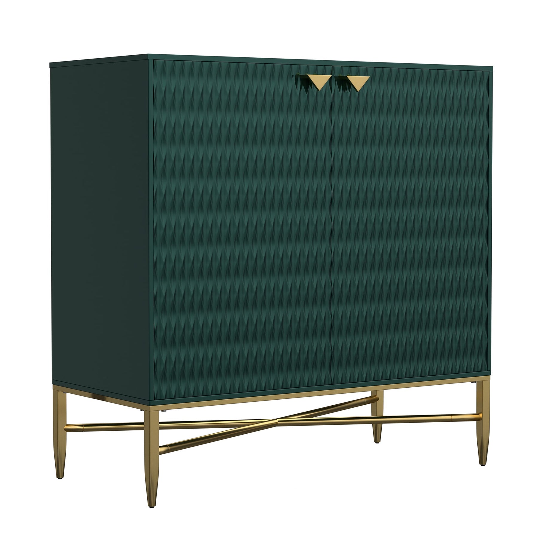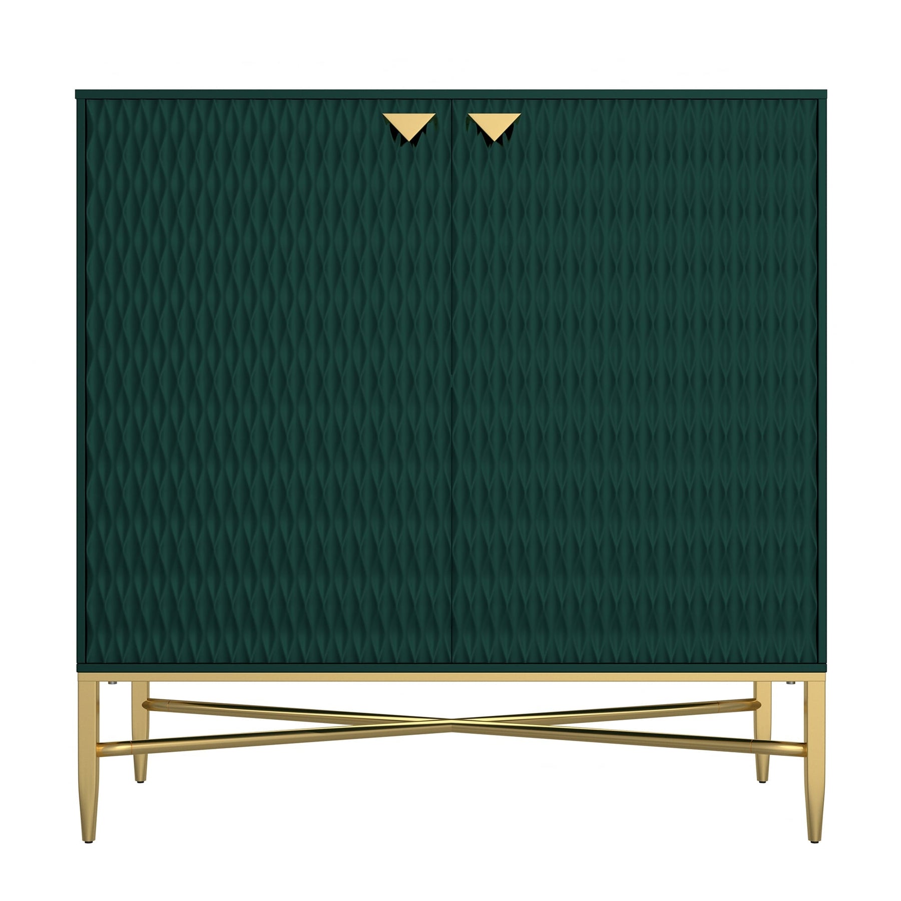 Enhance your living spaces with the Clihome Green Freestanding Utility Storage Cabinet. This stylish cabinet features an elegant raised diamond pattern and brass powder-coated X-tapered metal legs, perfect for modern interiors. It offers ample storage with adjustable shelves, making it versatile for various home and office uses.