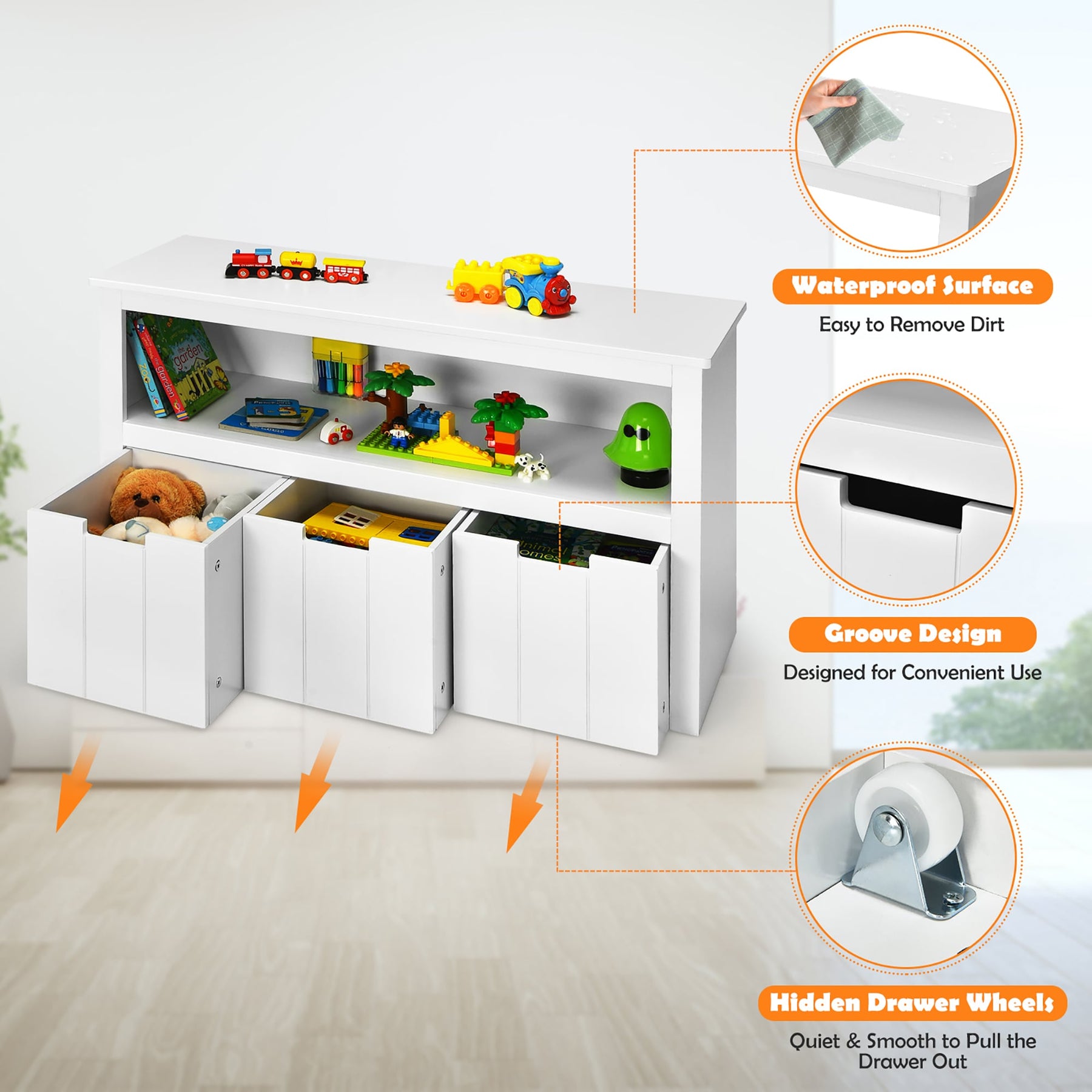 Maximize your space with the Costway Freestanding Utility Storage Cabinet, a modern, stylish solution that combines functionality with clean aesthetics. Crafted from durable MDF, this versatile cabinet features slide-out drawers with smooth wheels and offers ample storage, making it perfect for any room in the home. Its dual-purpose design transforms into a children's table by simply removing the drawers for dozens of home decor possibilities.