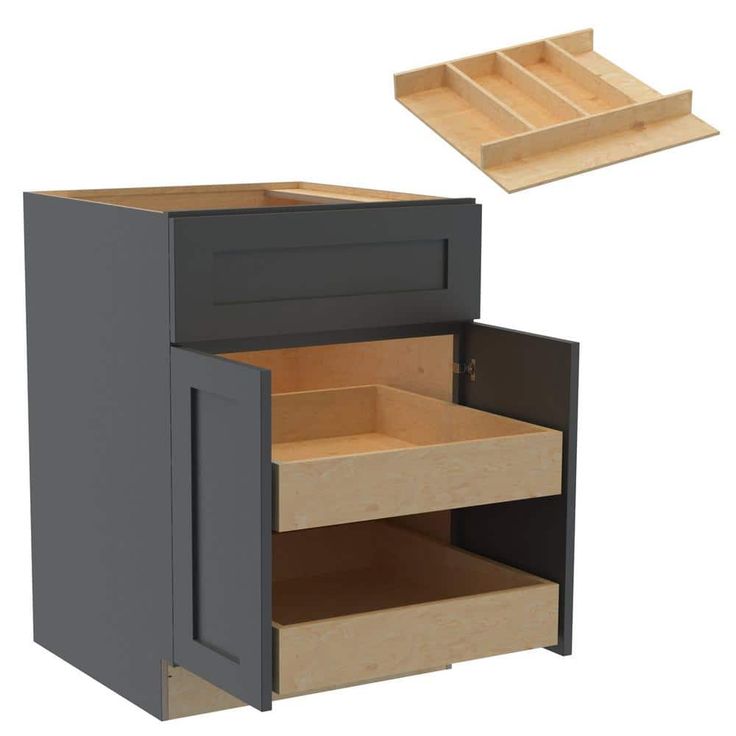 Upgrade your kitchen with the Newport Deep Onyx Kitchen Cabinet from Home Decorators Collection. This 24-inch wide, all-plywood base cabinet features a striking onyx gray finish and soft-close technology for a touch of elegance and functionality. With solid MDF shaker-style doors and full-depth shelves, organizing your space has never been more stylish or efficient.