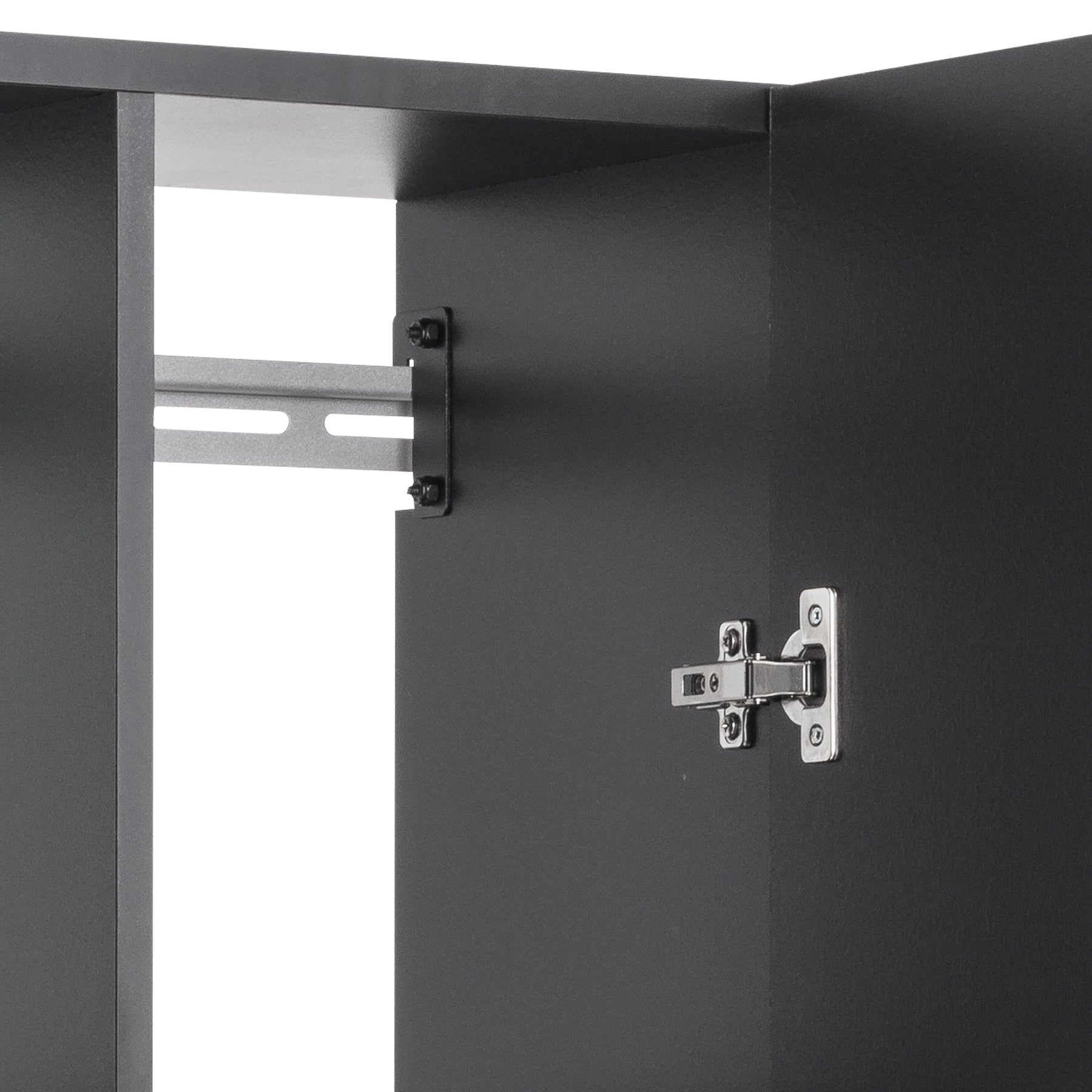 Optimize storage with the Prepac HangUps Black Wall-Mount Utility Storage Cabinet. This sleek, space-saving solution boasts a durable composite wood construction, ideal for garages, offices, or laundry rooms. Designed with 3 adjustable shelves and a fixed shelf, it adapts to your changing storage needs while offering robust support and easy assembly.
