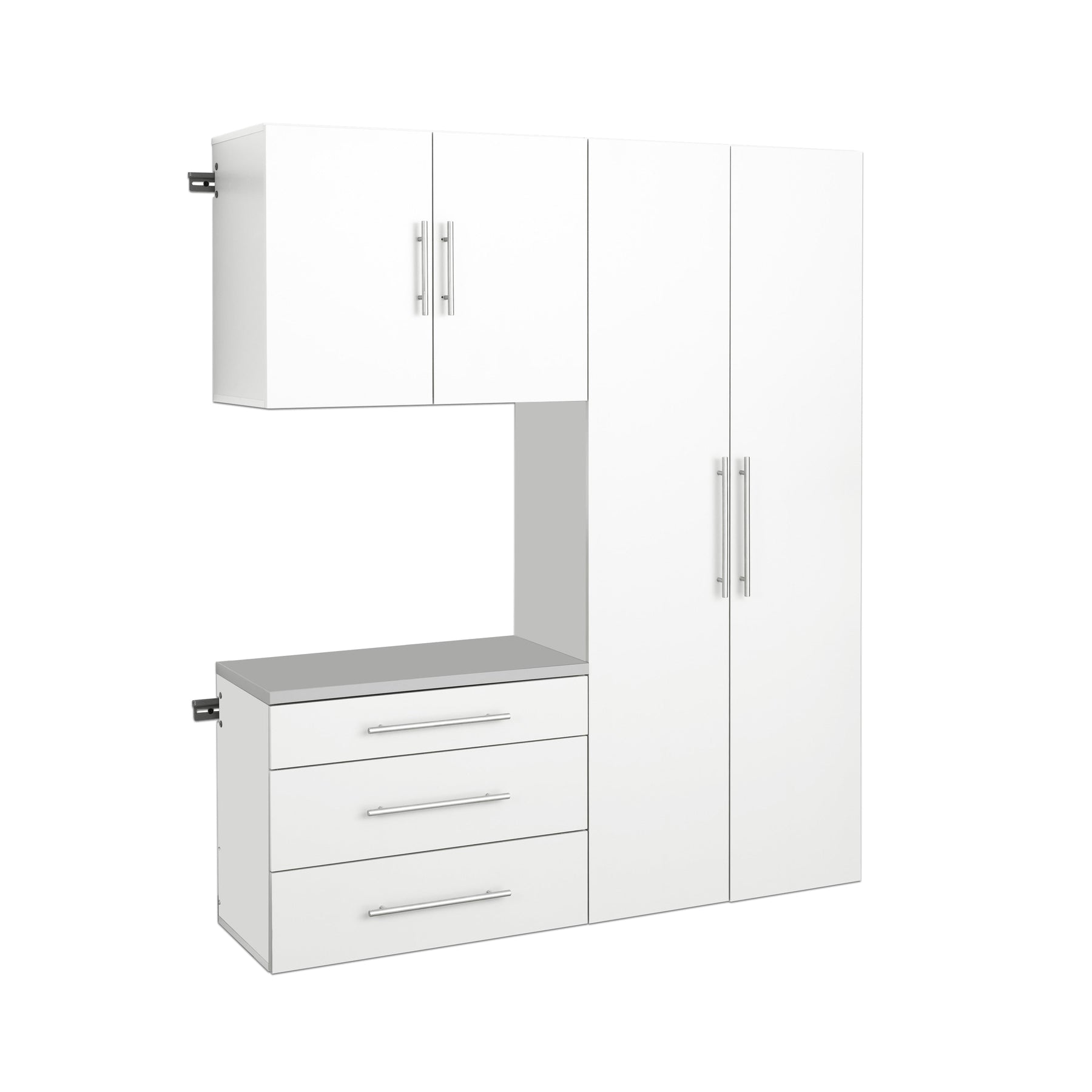 The Prepac HangUps Wall-Mount Utility Storage Cabinet offers a robust storage solution for garages, offices, and laundry rooms. Its wall-mounted design, combined with adjustable shelves and sophisticated white laminate finish, ensures maximum utility and elegance. An essential addition for organized and clutter-free spaces.