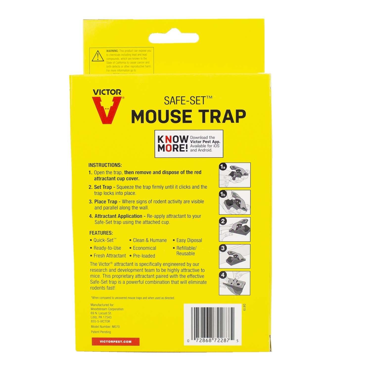 The Victor® Safe-Set™ Mouse Trap was engineered with safety as a top priority. The Safe-Set™ design prevents accidental triggers to keep you and your family as safe as possible. Not only is it safe for use around kids and pets when used as directed, it is also easy to use regardless of your experience level. Simply click the mechanism into place, place the trap and wait.