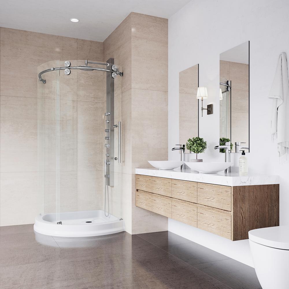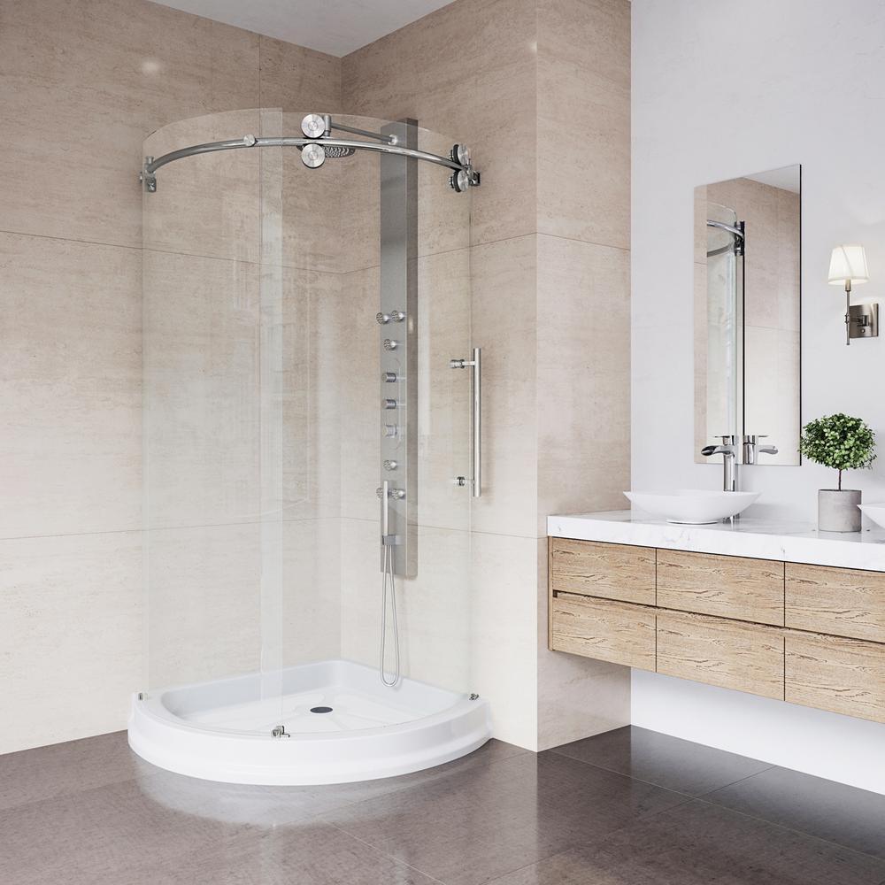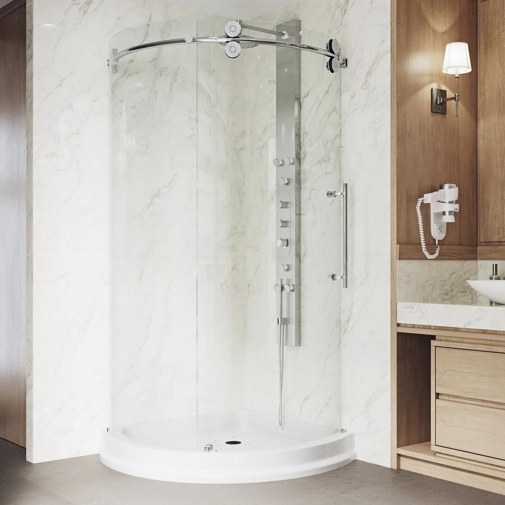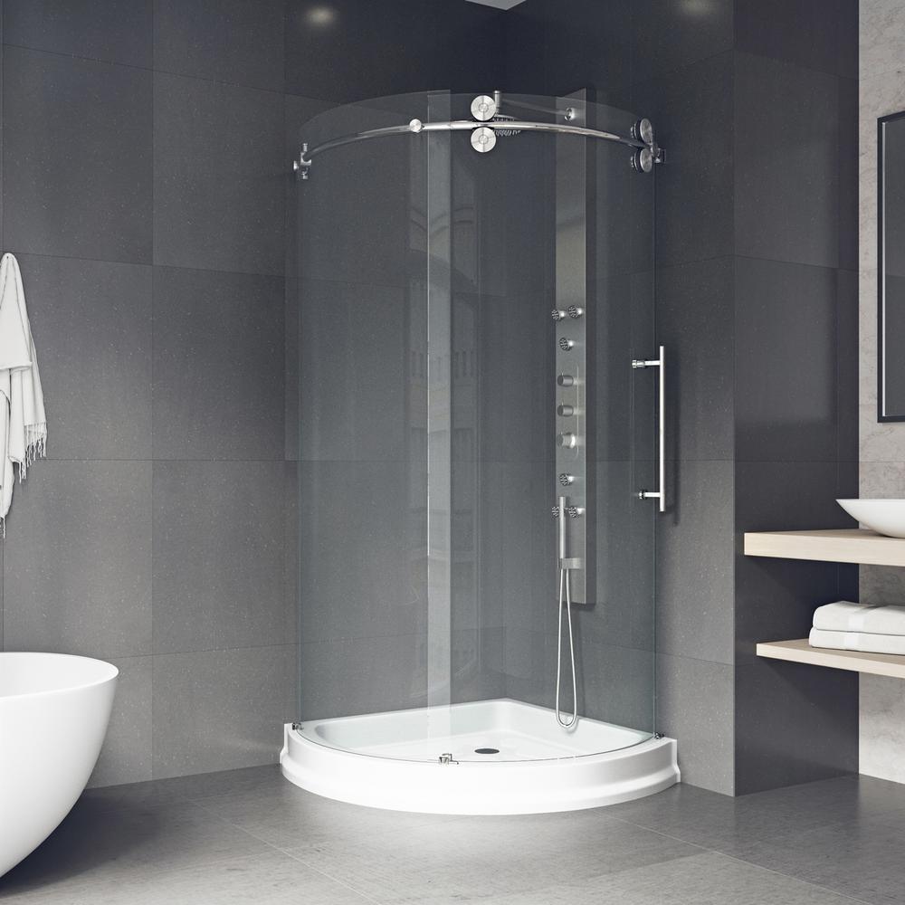 With its beautifully designed curves and sleek roller system, the VIGO Sanibel Frameless Round Sliding Door Shower Enclosure is sure to be a standout in your bathroom. This modern shower enclosure features infinity lines, stainless steel construction and tempered 5/16" glass to ensure its durability for the long run. This door opens from the right side and has a fixed panel for easy walk-in shower entry. For your convenience, an easy-to-clean, round white shower base is included with this shower enclosure.