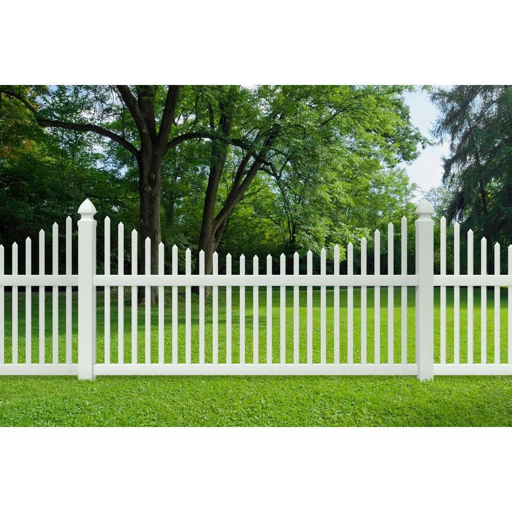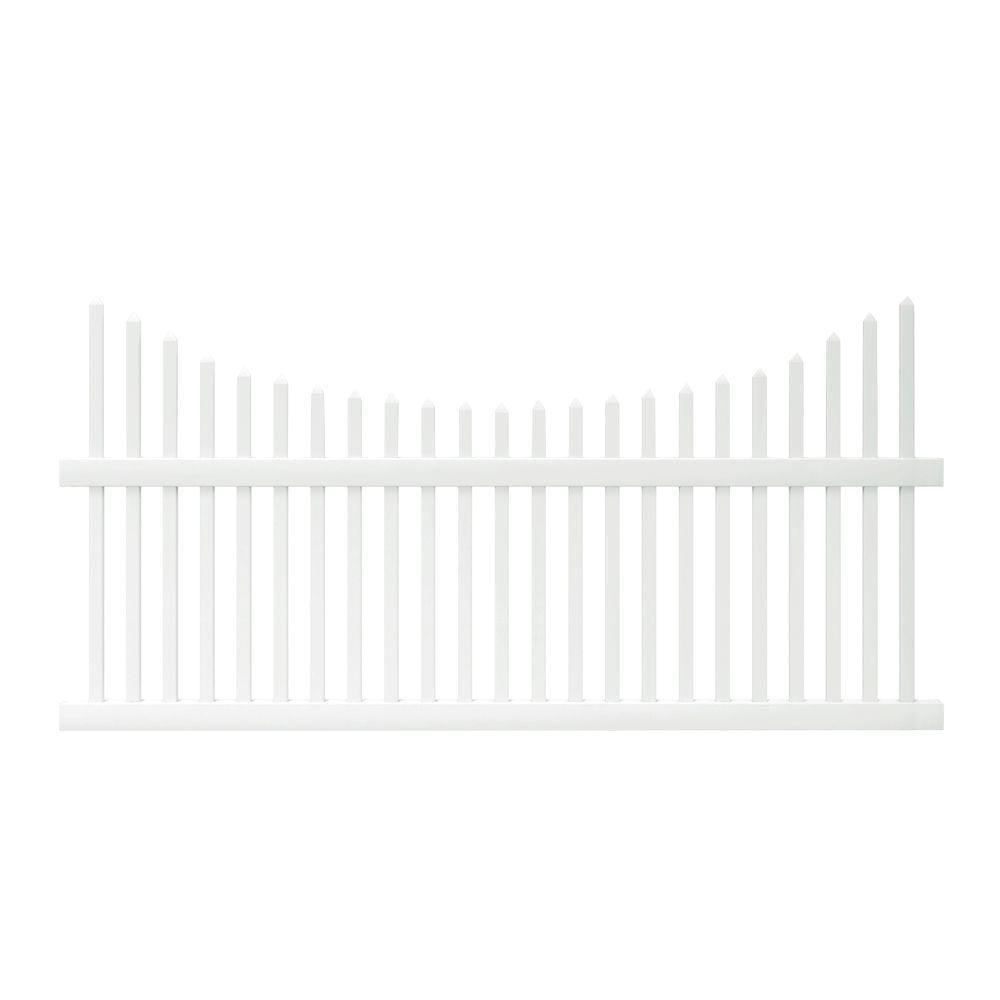 Upgrade curb appeal and keep your kids or pets safe in the yard with the 3.5 ft. x 8 ft. White Vinyl Alexandria Scalloped Spaced Picket Fence Panel. This panel is made of durable, low-maintenance vinyl - that never needs to be painted or stained. It comes in a ready-to-assemble kit with rails and pickets. The pickets simple slide into the rails. The rails lock into prerouted holes in the fence posts (sold separately) for a fastener-free look. This panel is rackable for installation on sloped landscapes. Backed by a lifetime limited warranty.