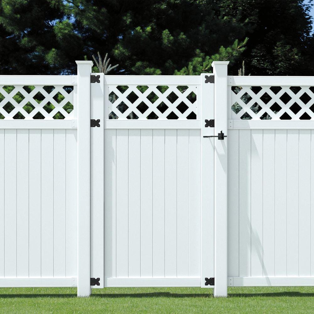 Enhance your fencing with the Veranda 3.5 ft. x 6 ft. White Vinyl Lewiston Lattice Top Fence Gate. Built from durable, low-maintenance vinyl, this decorative gate features a lattice top design that complements both traditional and modern styles, ensuring privacy and security while adding elegance to your outdoor space.