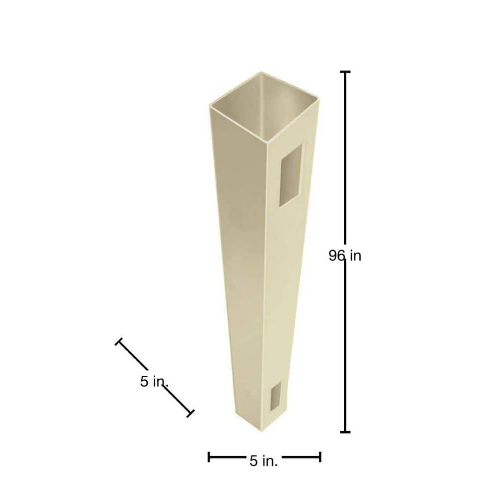 A: The post measures 5 in. x 5 in. x 96 in. (8 ft.) with approximately 0.135 in. wall thickness.