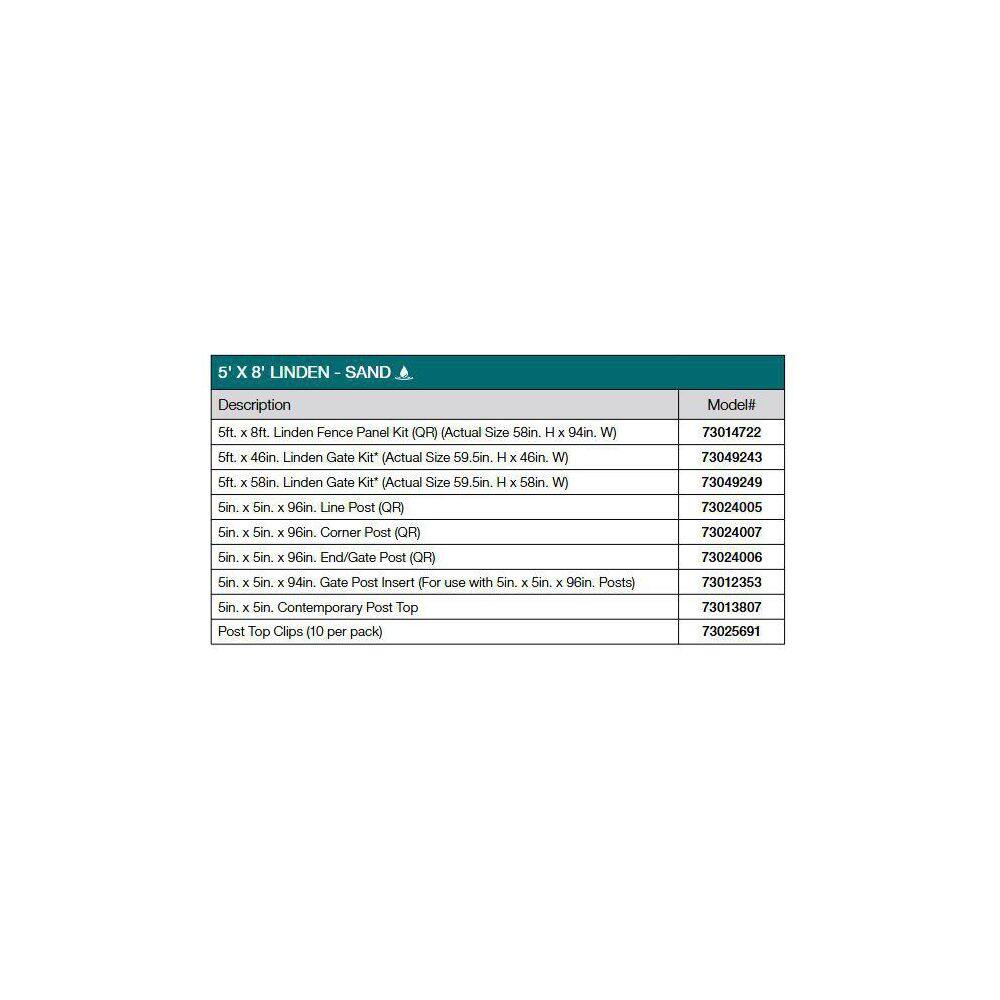 | Compatibility | Works with Linden 5 ft. H x 8 ft. Vinyl Fence Panel (model 73014722) |