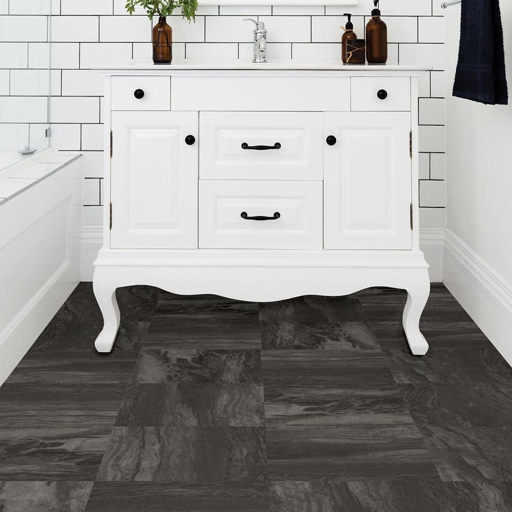 Marble-look peel-and-stick vinyl tiles deliver a bold, dark finish with effortless installation. Each 12 in. x 12 in. tile is water resistant and ideal for bathrooms, kitchens, and laundry rooms. Sold as a case of 20 tiles covering 20 sq. ft.