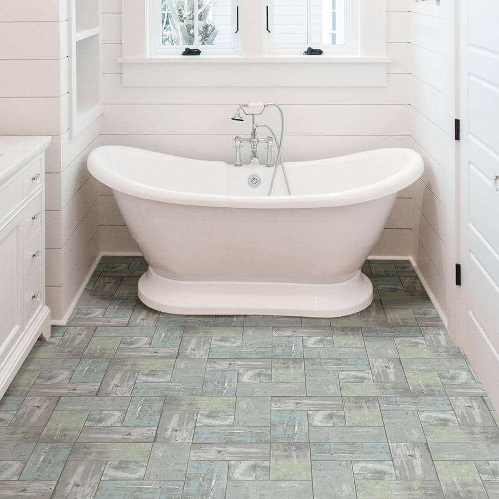 Coastal-look peel-and-stick vinyl floor tiles bring instant style and easy DIY installation. Each 12x12 tile is water resistant and ideal for bathrooms, kitchens, and laundry rooms. Case includes 20 tiles covering 20 sq. ft.