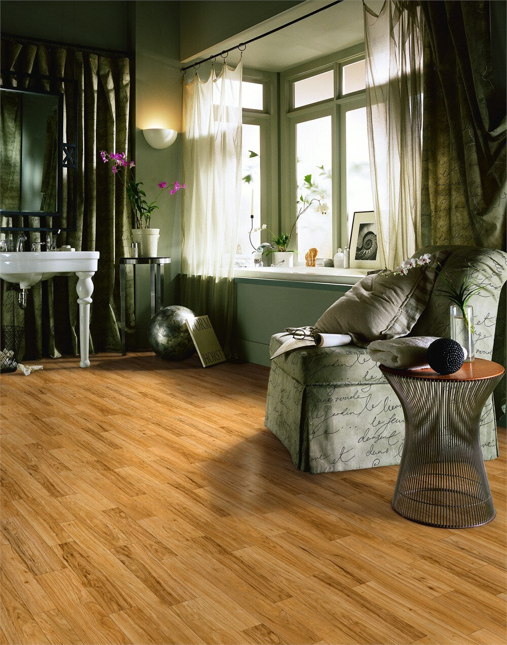 This sheet vinyl captures the golden striations of hickory with a quiet low-gloss finish that instantly softens a room. The plank pattern and gentle texture ground the space in natural warmth while remaining wonderfully practical. Pair it with mossy greens and brushed brass for a refined, organic palette, or let it glow beneath creamy cabinetry in a sunlit kitchen. It’s a chic, resilient foundation—essential for elevated everyday living.