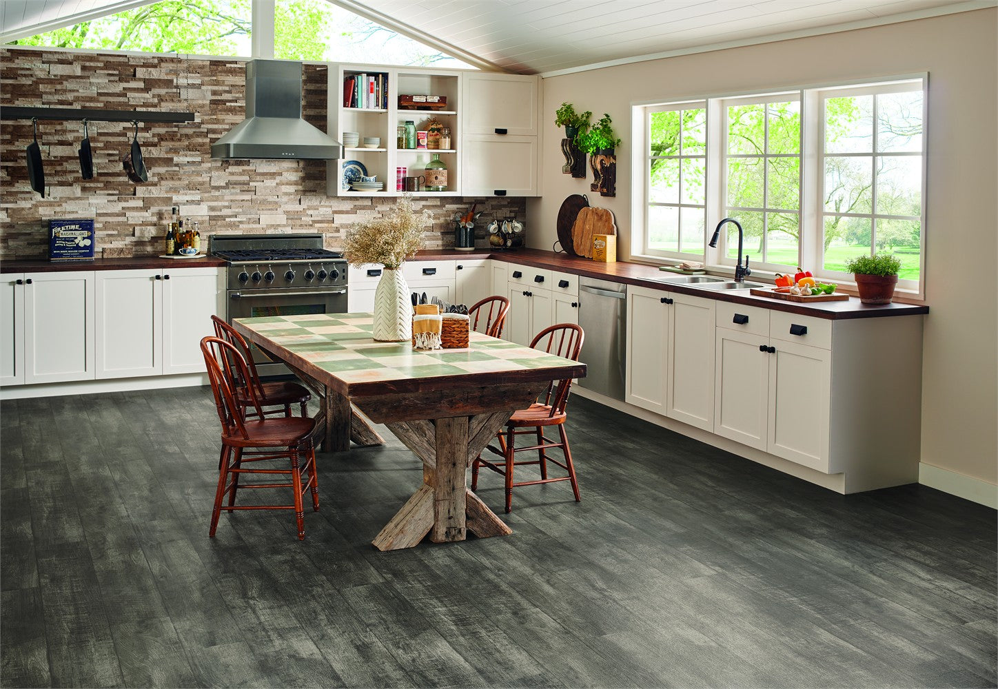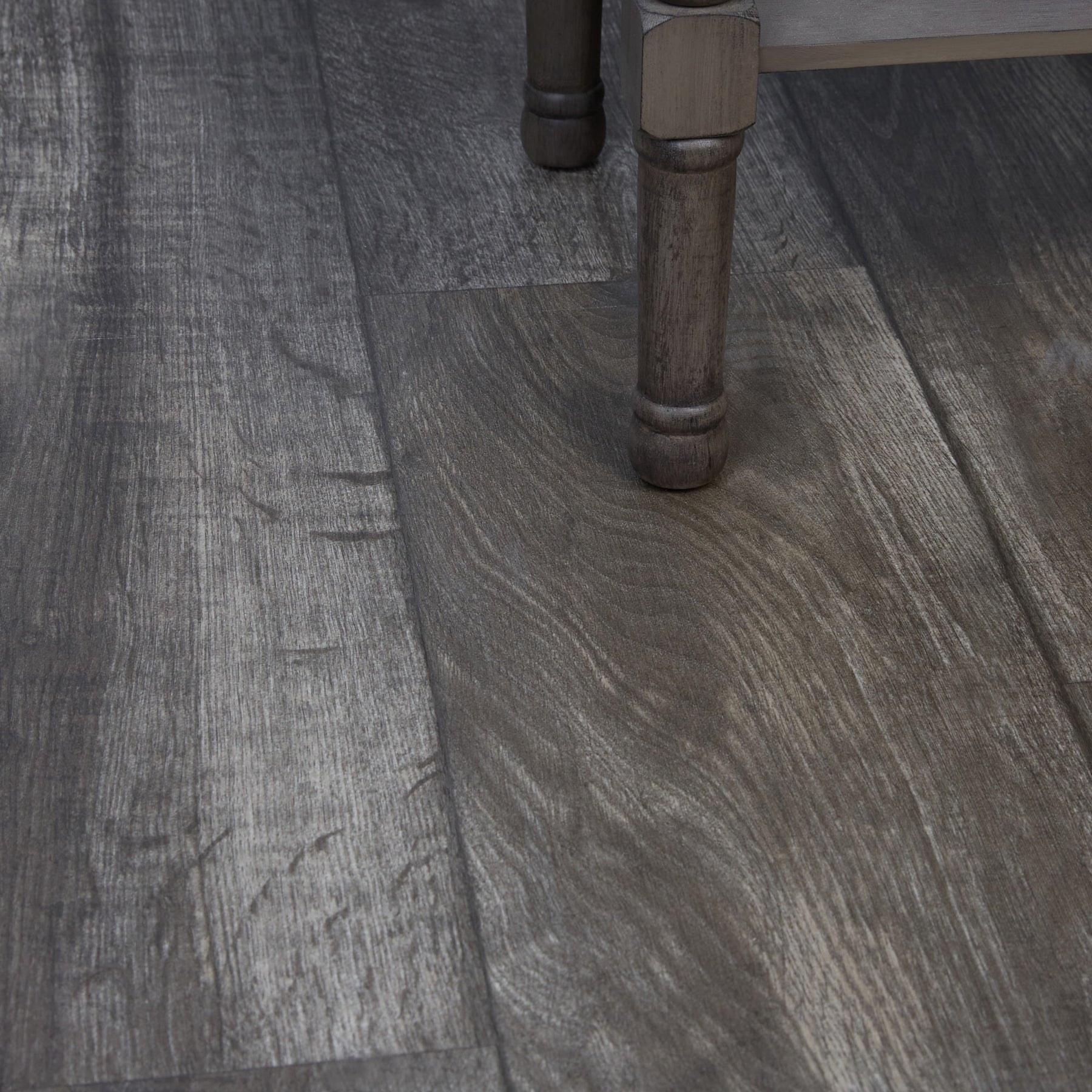 This sheet vinyl channels the moody sophistication of weathered wood, lending depth and texture to kitchens and baths without the upkeep. The distressed band‑saw marks and wide plank visuals feel artisanal yet modern. Pair it with creamy cabinetry and matte‑black hardware for a fresh contrast, or layer in warm woods to soften the cool gray. It’s a luxe, practical foundation that elevates everyday living.