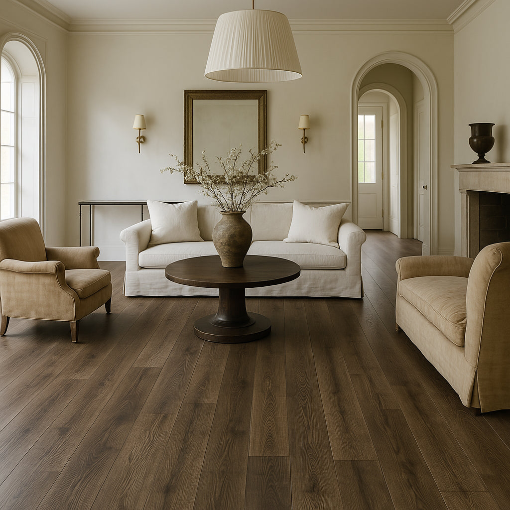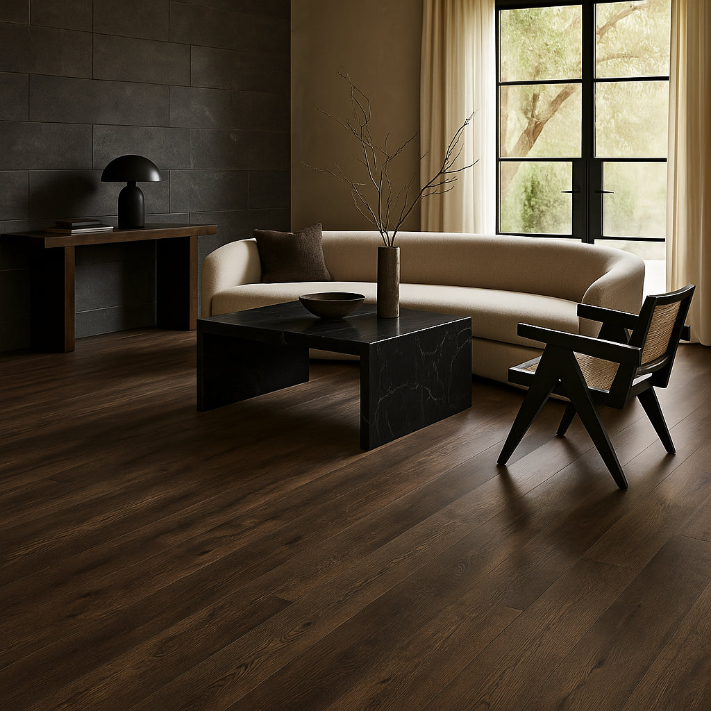 The CALI Aqua Tough Thornwood flooring transforms any room into a haven of sophistication and durability. Its rich, dark wood grain texture adds depth and warmth, creating a luxurious ambiance. Pair it with modern furniture and metallic accents for a chic, contemporary look. This flooring is not just a surface; it's a statement of style and resilience, perfect for high-traffic areas and homes with pets or children.