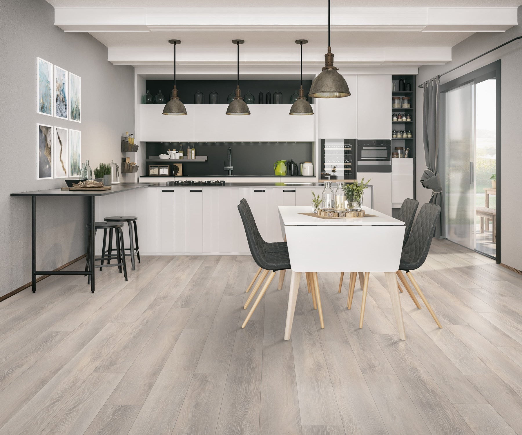 Castaway Oak washes the space in a soft, sun-bleached tone that feels airy and refined. The premium wood grain embossing adds tactile depth, lending authenticity underfoot. Pair it with matte black hardware and linen textures for a chic, coastal-modern vibe. It’s a smart, luxurious foundation that effortlessly elevates daily living.