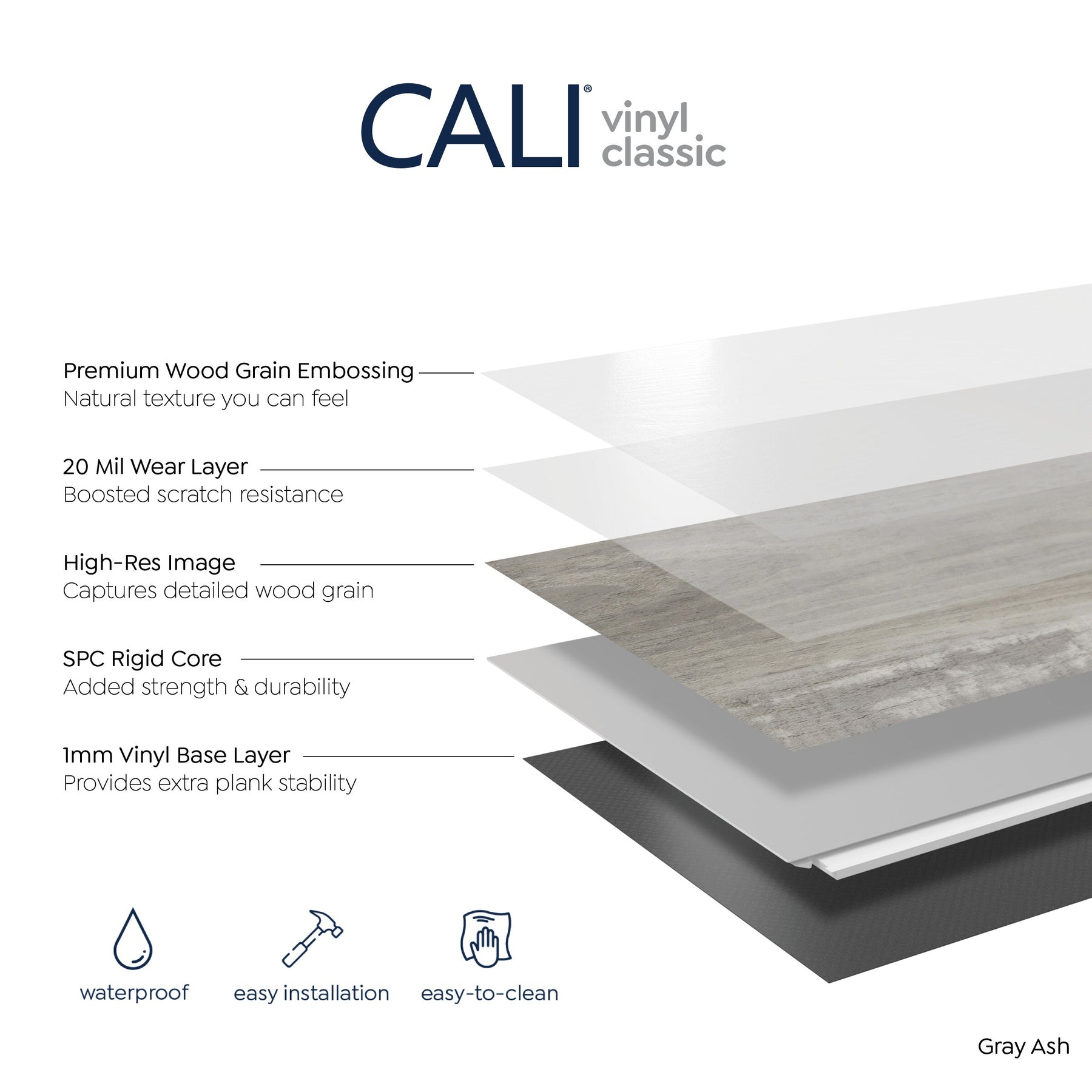 CALI Pro Classic Gray Ash LVP brings the look of weathered oak with the durability of a 5.5‑mm SPC rigid core and a 20‑mil wear layer. These wide, 7-in x 48-in planks are 100% waterproof with an easy click-lock system, ideal for busy homes and light commercial spaces.