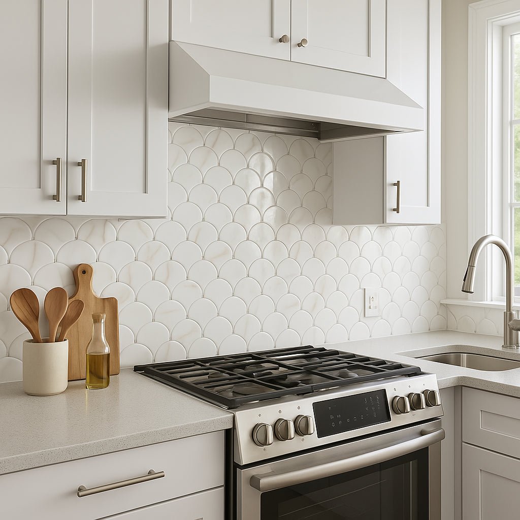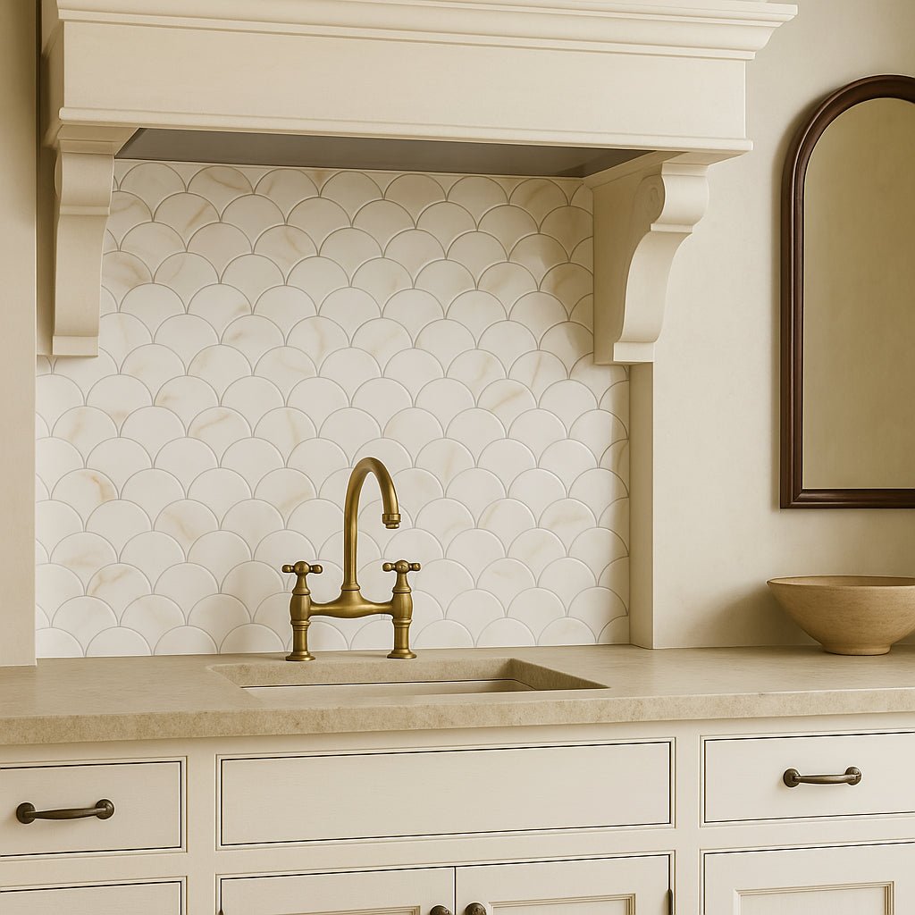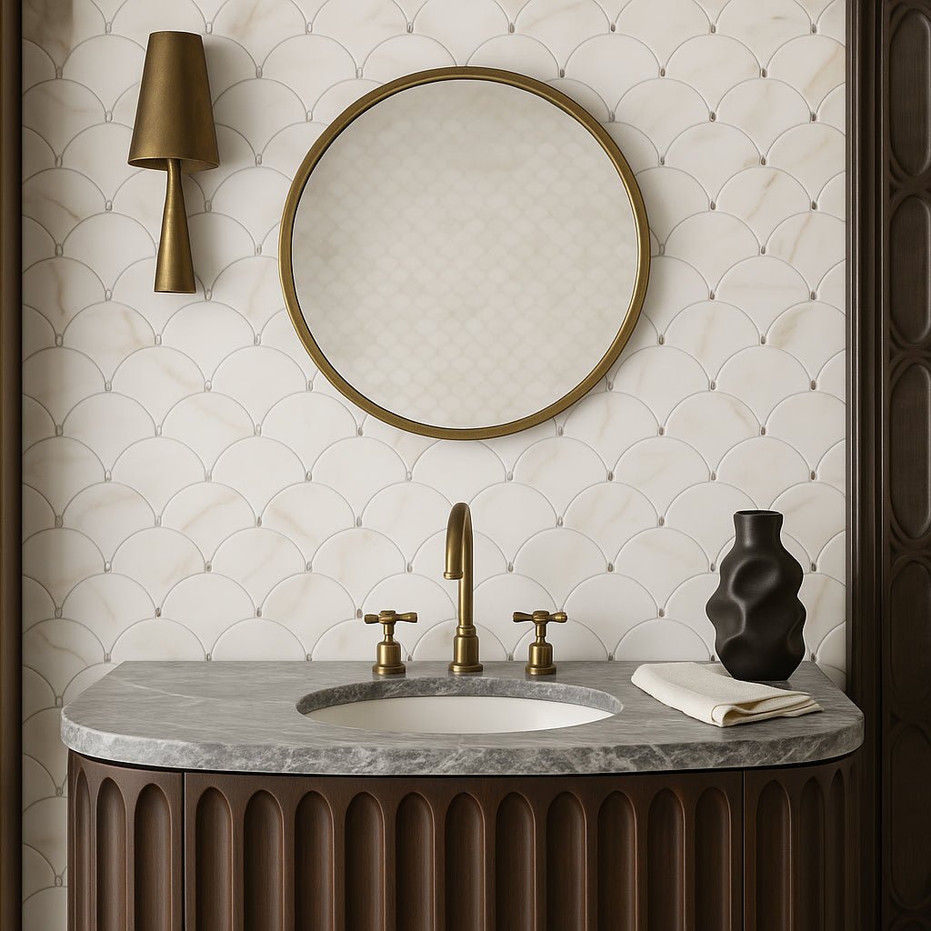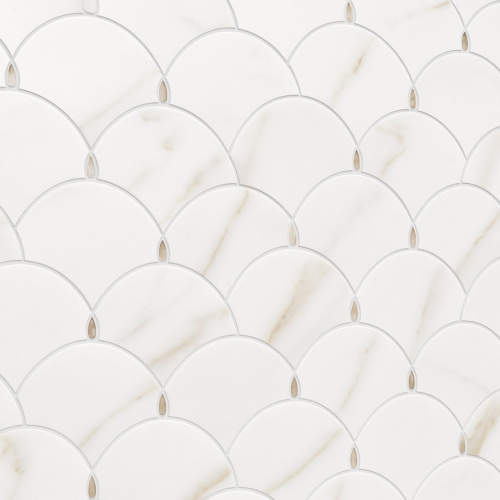 The Aemelia Mop Recycled Glass Mosaic transforms any interior into a sanctuary of sophistication. Its polished white glass and intricate fan design create a luminous effect, perfect for shower walls or accent areas. Pair it with gold fixtures or natural wood elements to enhance its luxurious appeal. This mosaic is not just a tile; it's a statement of refined taste and sustainable living.