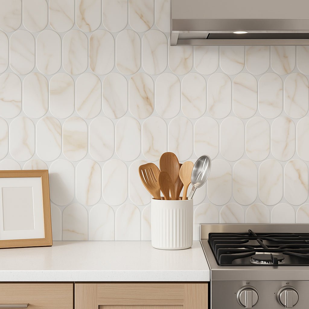 The Marquise Oval Recycled Glass Mosaic is a masterpiece of design, blending sustainability with sophistication. Its polished white finish and unique oval pattern create a luminous effect, perfect for elevating any interior. Use it to craft a stunning backsplash in your kitchen or a serene ambiance in your bathroom. This tile is not just a decorative element; it's a statement of refined taste and eco-conscious living.