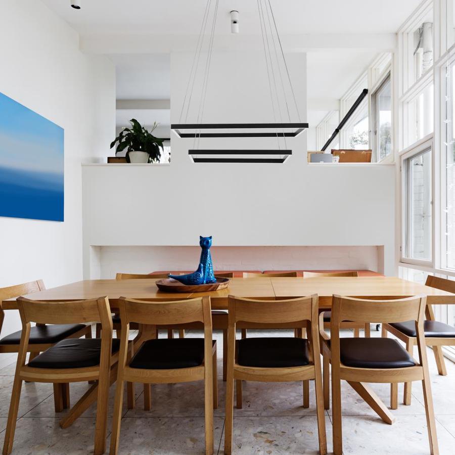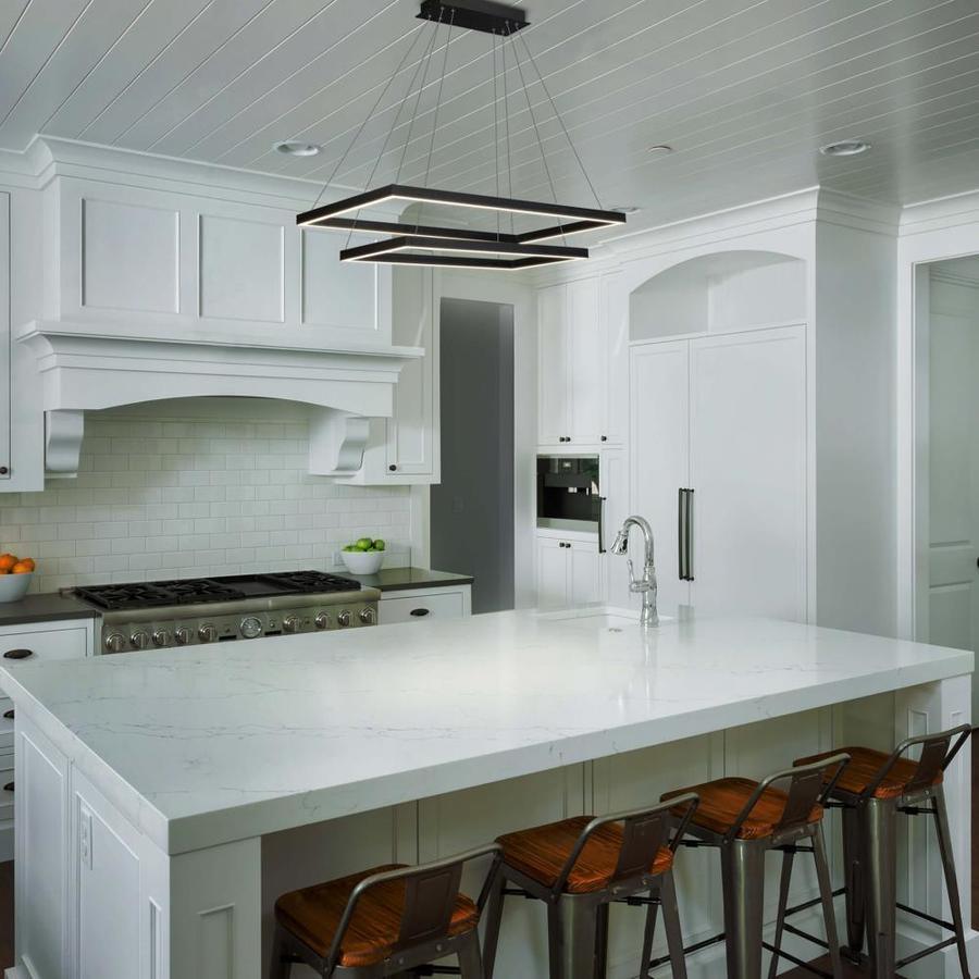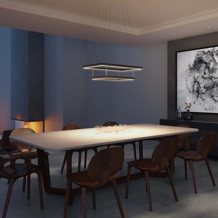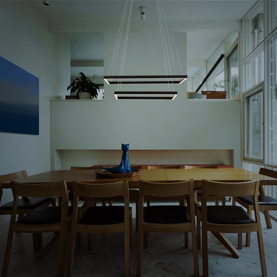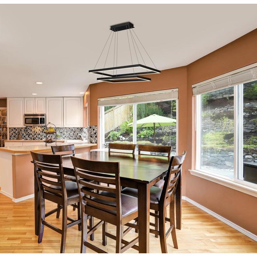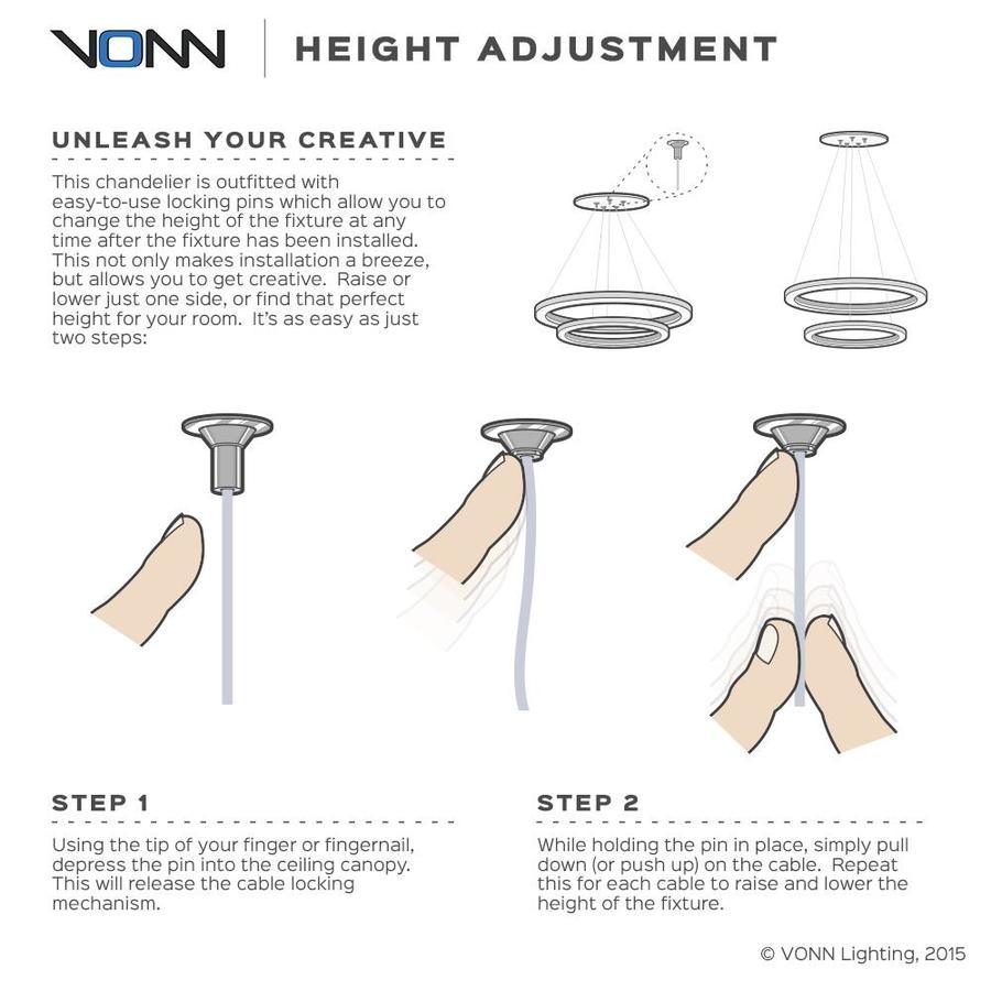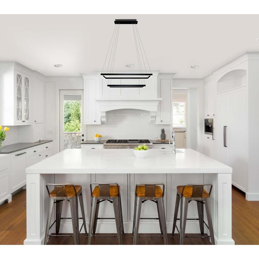 Unique design - ultra-low-profile design with easily adjustable suspension Adjustable - cable locking pins allow the suspension height to be easily changed post-install Dimmable to 15 percent with ELV - Electric low voltage dimmers (dimmer is not included with the fixture); ELV dimmer compatible only; WiFi, smart, and universal dimmers are not compatible LED - integrated LED fixture Soft white - 3000 kelvin color temperature, brightness - 3270.1 lm, efficiency - 74 W total consumption, CRI 90 29.25 in. L x 17.25 in. W x 120 in. maximum H (6 in. minimum H) Slanted/sloped ceiling compatible Installer tip: do not cut wires attached to the fixture under any circumstance, excess cable should be neatly looped and tucked into the canopy Voltage - operates on standard 120 line voltage, dry location approved, ETL, cETL, title 24 compliant, title 20 compliant, prop 65 compliant, Energy Star Compliant