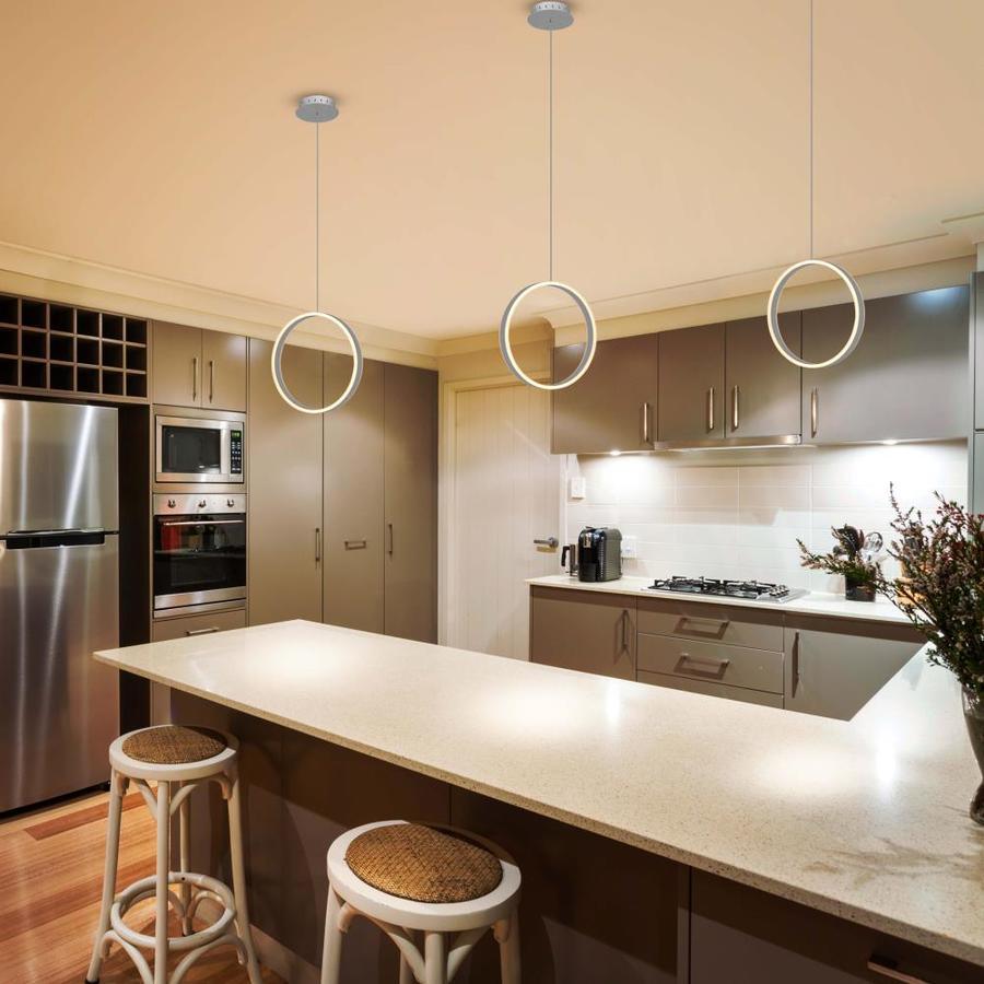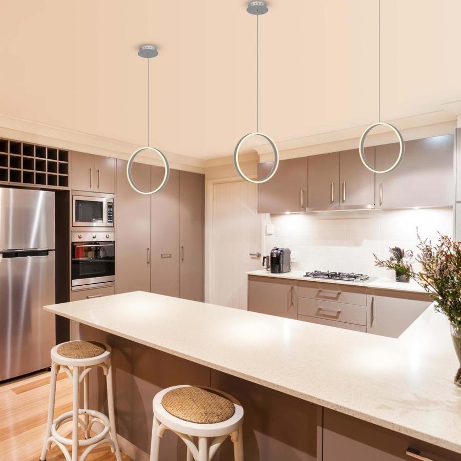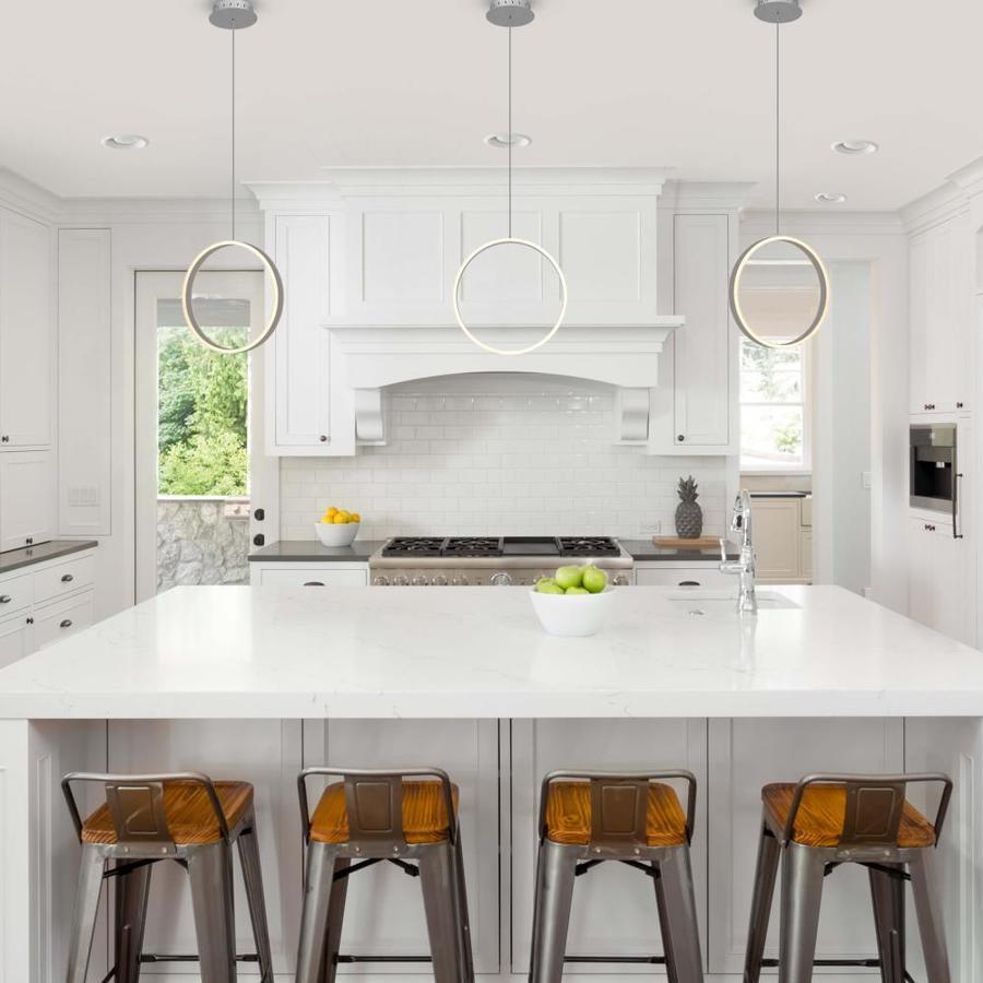 Design- modern pendant light Adjustable - cable locking pins allow the suspension height to be easily changed post-install Dimmable to 15 percent with ELV - Electric low voltage dimmers (dimmer is not included with the fixture); ELV dimmer compatible only; WiFi, smart, and universal dimmers are not compatible LED- integrated LED fixture Soft white - 3000 kelvin color temperature, brightness - 1028 lm, efficiency - 34 W total consumption 15.75 in. L x 15.75 in. W x 118 in. maximum H (21.75 in. minimum H) Slanted/sloped ceiling compatible Installer tip: do not cut wires attached to the fixture under any circumstance, excess cable should be neatly looped and tucked into the canopy Voltage - operates on standard 120 line voltage, dry location approved, ETL, cETL, title 20 compliant, prop 65 compliant, Energy Star Compliant