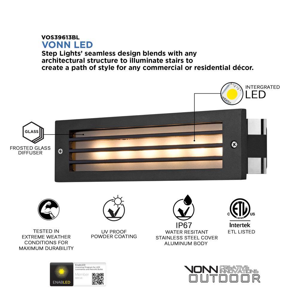 Vonn Outdoor LED Step Lights are constructed in an aluminum body with UV proof powder coating to resist all weather conditions. Such construction offers up to 50000 hours of life spam along with a 5-Year Limited Warranty. VONN LED Step Lights' seamless design blends with any architectural structure to illuminate stairs to create a path of style for any commercial or residential decor.