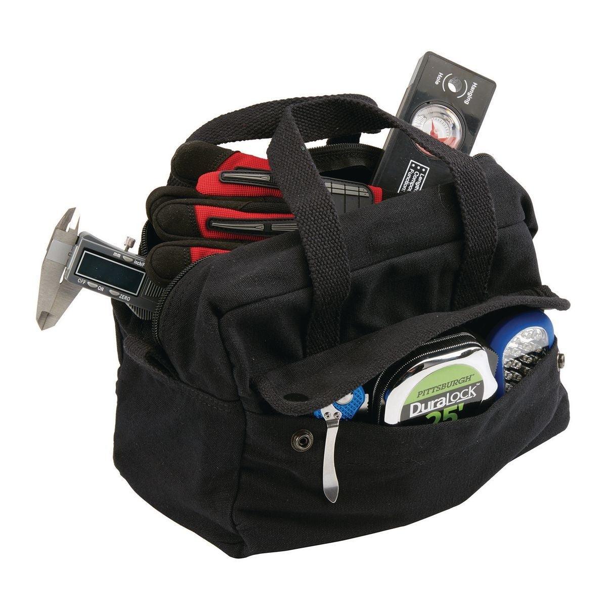 This handy 11 in. tool bag gets your tools and supplies from the shop to the job site. The tool bag comes with a reinforced bottom and an exterior pocket for quick access to frequently used tools. An inside pocket keeps extra blades, bits and other sharp items from damaging your tools during transportation.