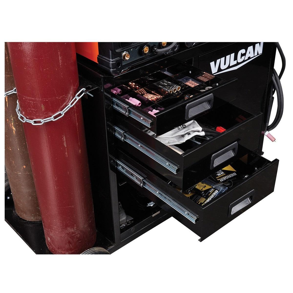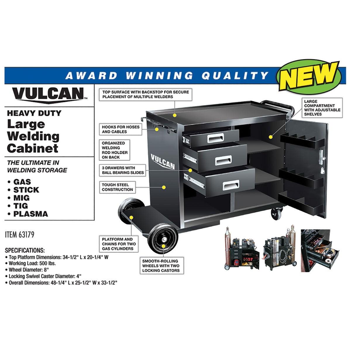Keep your gas, arc and MIG welding gear safely organized and ready for work with this rugged mobile cabinet. The top surface has plenty of space to hold a MIG, a TIG and a plasma cutter with ample room for ventilation. The backstop helps keep your machinery secure. Four organized drawers and generous locking cabinet give you accessible dry storage for tips, accessories, grounding clamps and welding supplies.