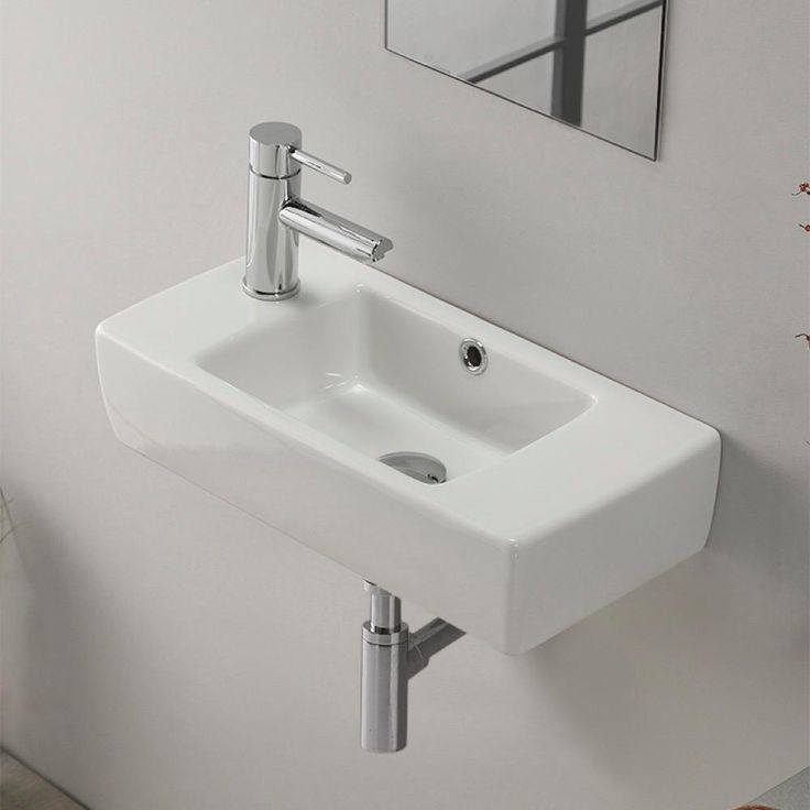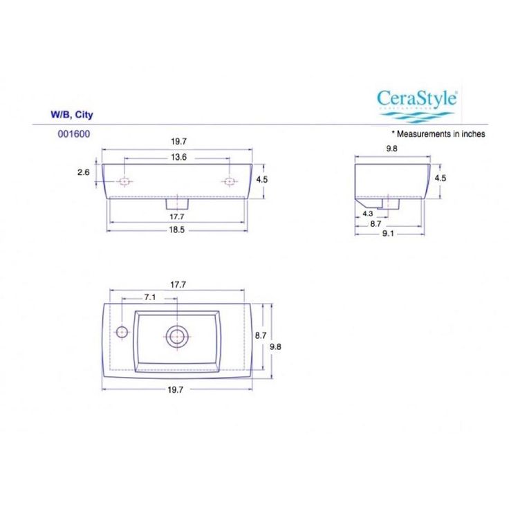 19.7 in. modern, sleek wall mounted or self-rimming bathroom sink. Sink includes 1 pre-drilled faucet hole on the left side of the sink and an overflow. This beautiful, space saving bathroom sink is made of high-quality white ceramic. Sink is designed by luxury and well known Turkish brand CeraStyle.