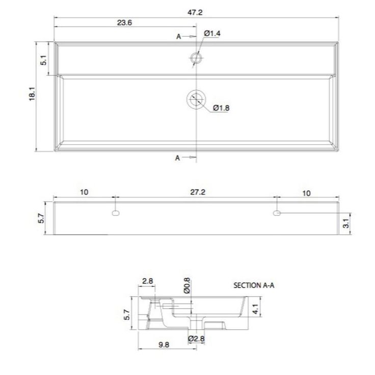 This rectangular ceramic sink can be used as a wall hung bath sink or as an above mount bath sink. Featuring a sleek double trough sink design with overflow and available in six hole style. Great choice for modern bathrooms