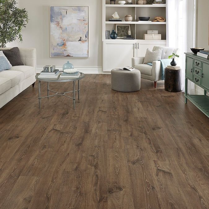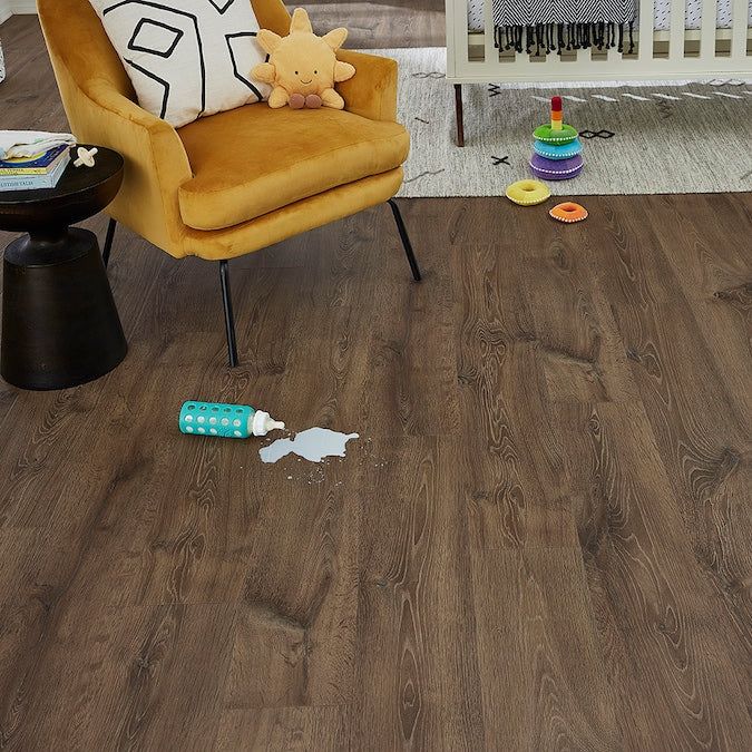 The Stockette Oak Waterproof Laminate Flooring transforms any room with its rich, chocolate-brown hues and authentic oak grain pattern that echo classic European styling. Its standout pressed bevel edges and realistic textured surface make it a sophisticated backdrop for any décor. Use this flooring to create a dramatic, yet inviting living room or an elegant but functional kitchen that resonates luxury and simplicity. Essential for those who value chic design and practical living, this flooring brings a touch of refined beauty to every corner of your home.