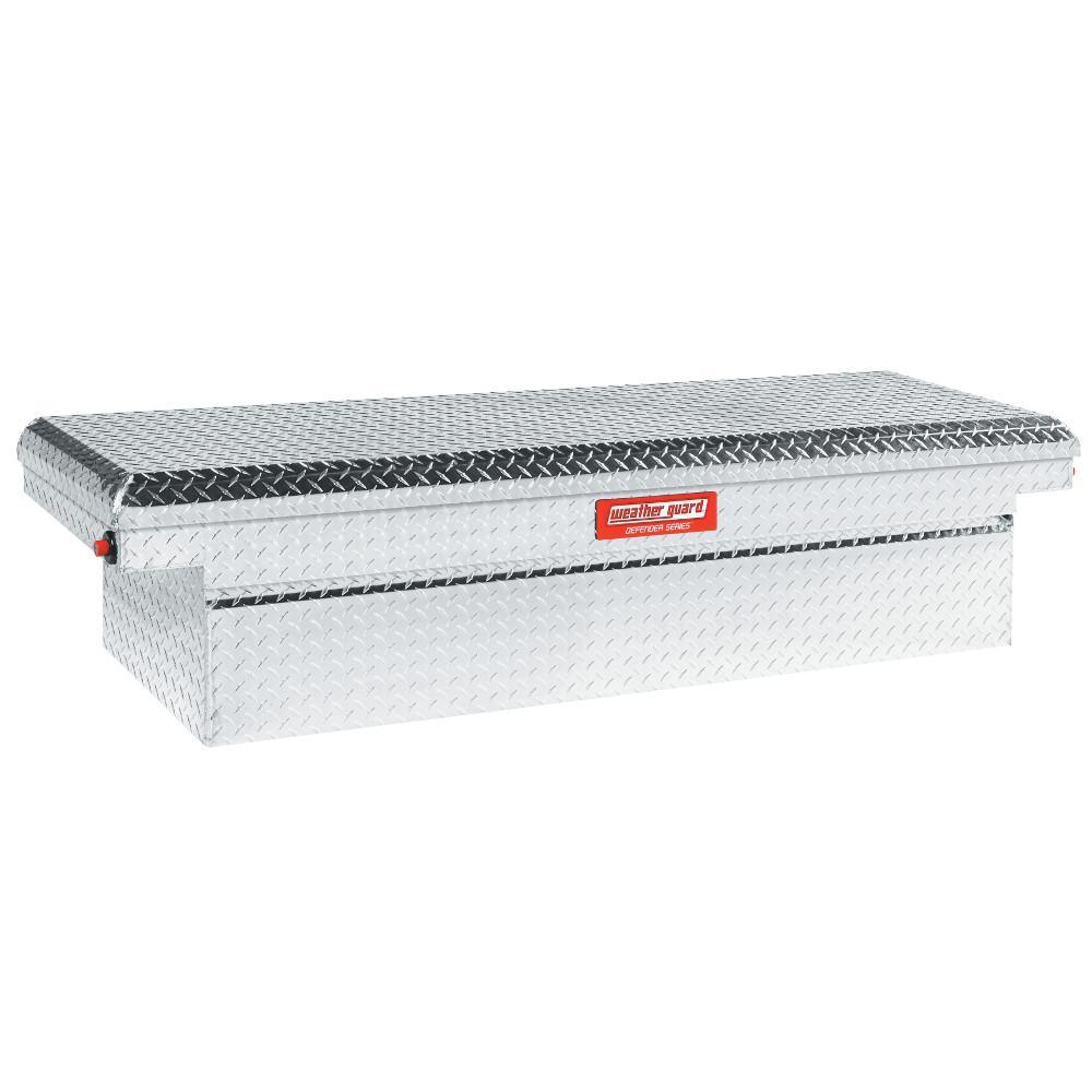 Regular price $463.17The 9.5 cu. ft. Weather Guard Defender series Model 300106-53-01 Low Profile Saddle Box for full size trucks provides professional protection. This new truck box includes a tamper-resistant push-button lock, steel reinforced, looped strikers, D-shaped ribbed weather stripping, heavy-duty 4-piece welded aluminum box construction and black powder coat finish. Provides professional durability with 4-piece welded construction putting strength where it is needed most.