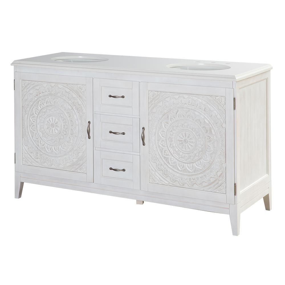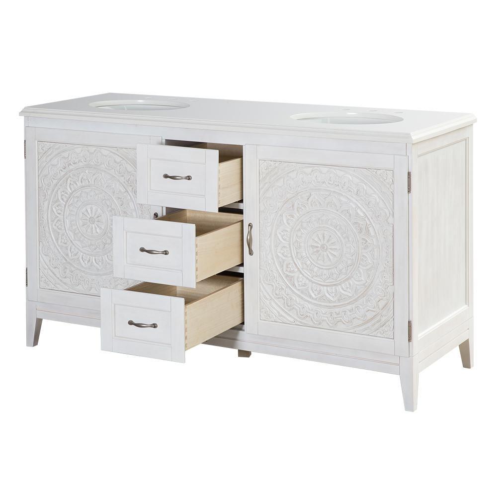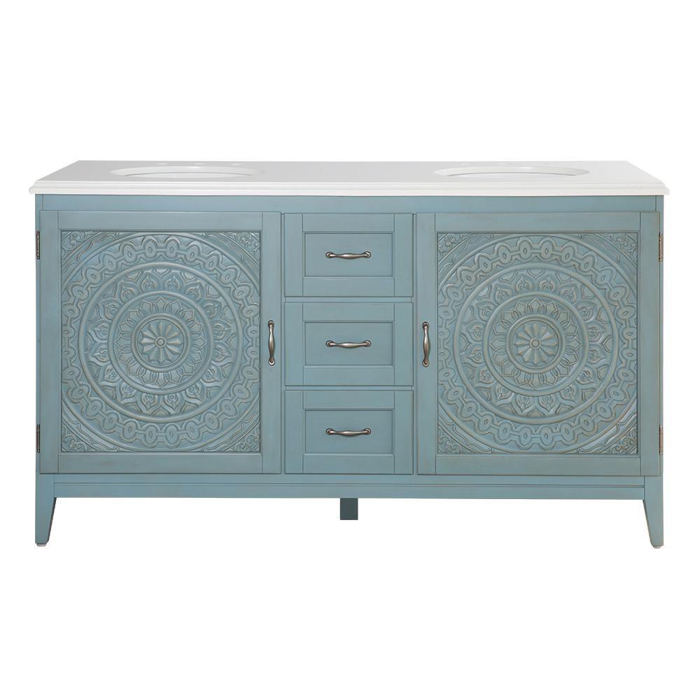 Looking for a stylish double vanity with world-class appeal. Our Chennai 61 in. W Double Bath Vanity is the perfect choice. Liven up your bathroom decor with this double bath vanity in a beautiful blue wash finish featuring a pristine, engineered, crystal white stone top with white basins. Accented with brushed nickel fixtures and a unique medallion design etched into its cabinet door fronts, this stunning blue wash double vanity also includes plenty of storage space with an adjustable inner shelf inside of a spacious 22 in. D cabinet. Full of luxurious appeal, this double bath vanity will wow guests and help create a spa-like experience right at home.