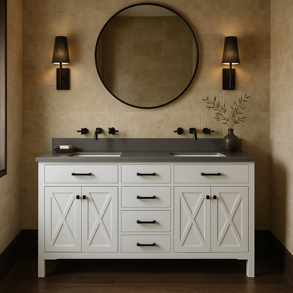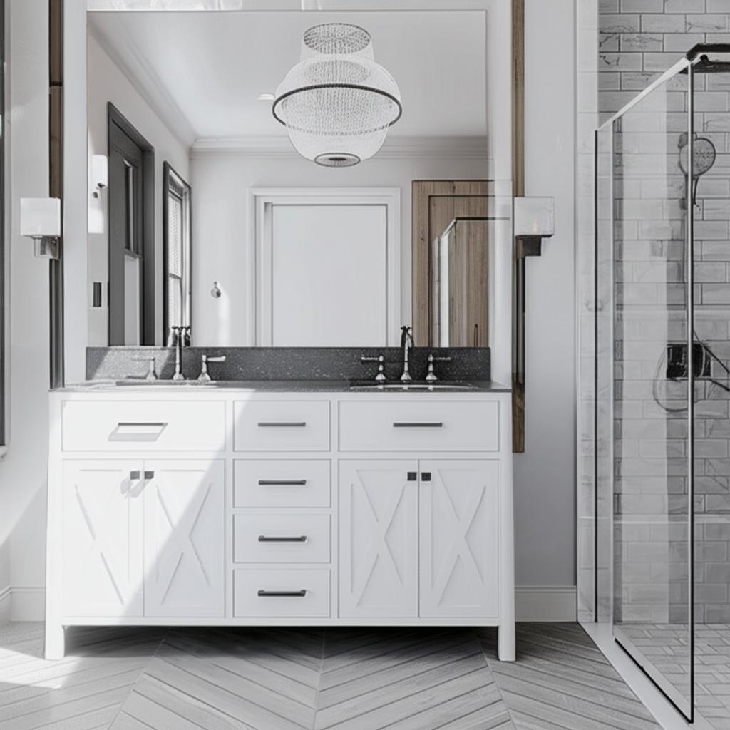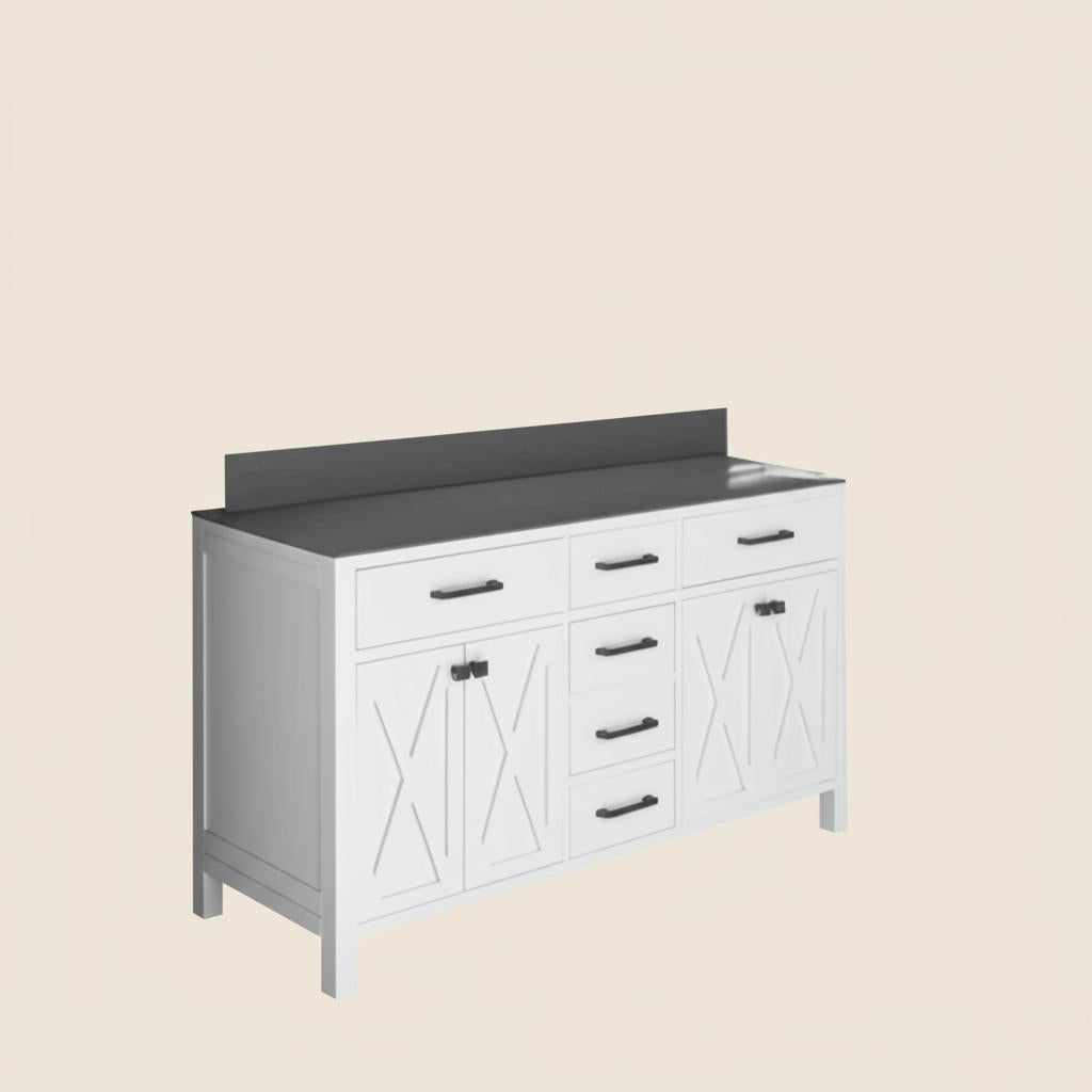 Transform your bathroom into a sanctuary of style with the Ainsley 60-inch vanity. Its barn-inspired X cross-braced cabinet doors and crisp white finish evoke a modern farmhouse charm, while the gray cultured stone countertop adds a touch of sophistication. Pair it with matte black hardware for a striking contrast, and style with lush greenery or vintage accents to complete the look. This vanity is not just a fixture; it's a statement of luxurious living.