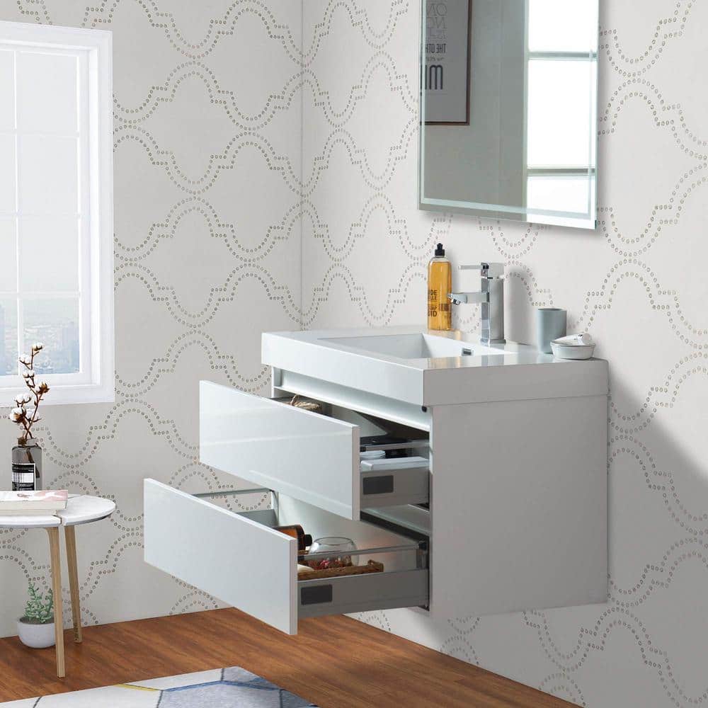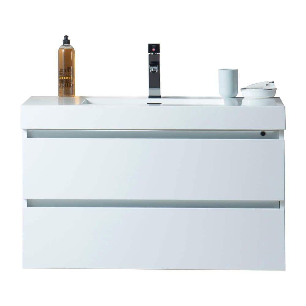 Modern floating vanity crafted from moisture-resistant MDF in a glossy white finish, featuring integrated LED accent lighting and soft-close drawers. Includes a single-basin white resin vanity top and rectangular undermount sink for a clean, streamlined look.
