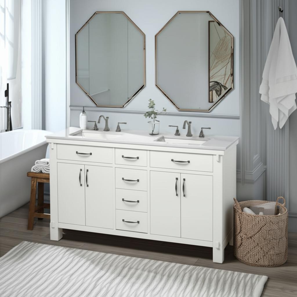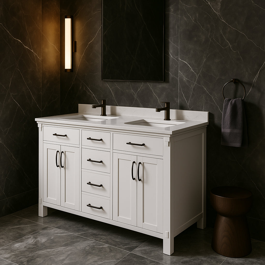 The Bellington Double Sink Vanity combines farmhouse-inspired design with modern functionality. Featuring a white engineered stone countertop, antique black hardware, and ample storage, this pre-assembled vanity is perfect for elevating your bathroom decor.