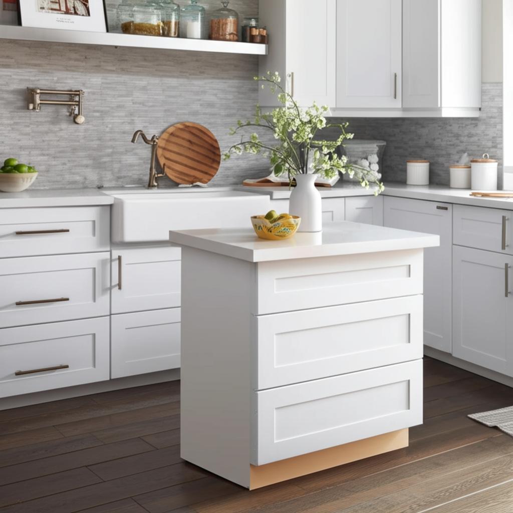 - Elegant Design: Shaker-style doors with a recessed center panel and painted Pacific White finish.