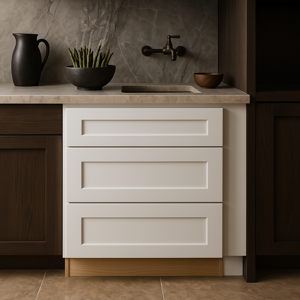 The Newport Pacific White kitchen cabinet combines durable plywood construction with elegant shaker-style doors and a painted finish. Featuring adjustable shelves and soft-close doors, it offers both style and functionality for modern kitchens.