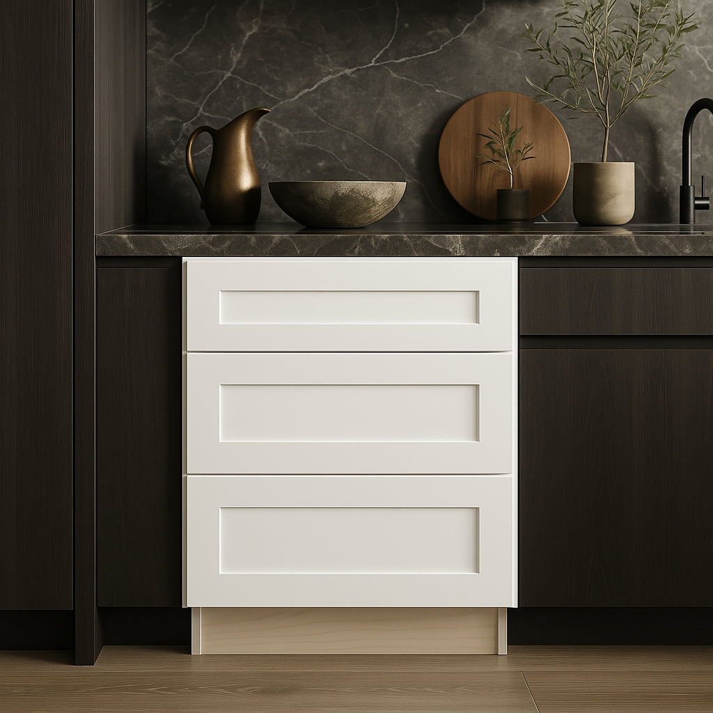 The Newport Pacific White Drawer Base Kitchen Cabinet combines durable plywood construction with a stylish shaker design. Featuring soft-close drawers and a painted finish, it offers both functionality and elegance for your kitchen.