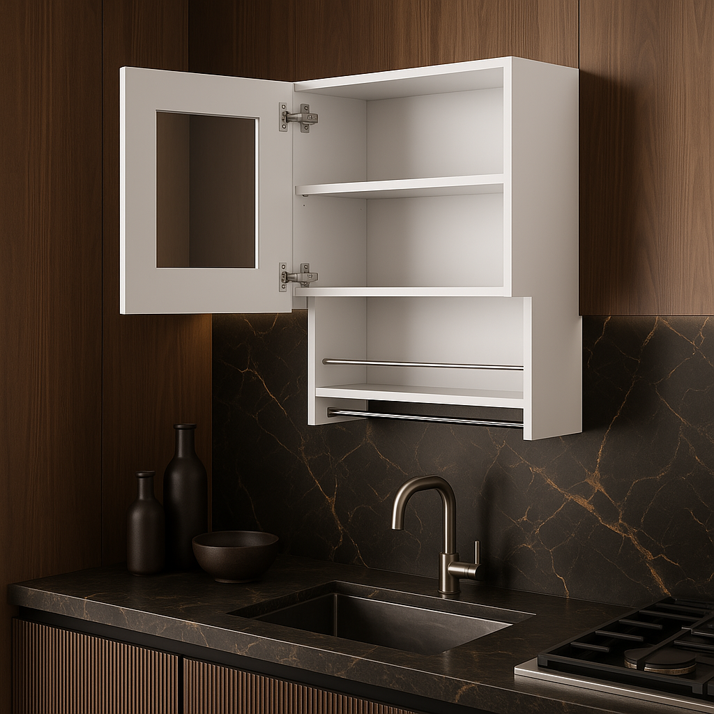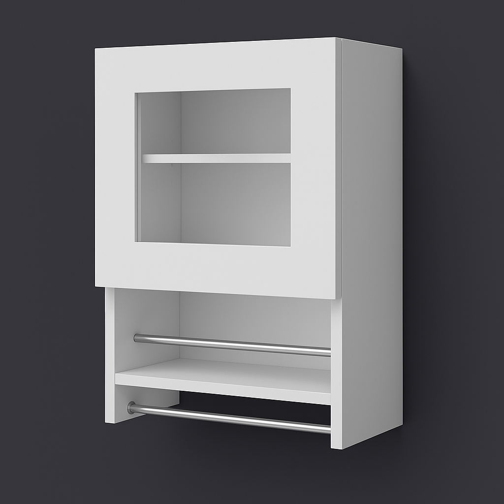 This wall cabinet is a masterpiece of modern kitchen design, blending functionality with style. Its sleek white finish and glass door create a sophisticated look, while the spice and towel racks add practical convenience. Perfectly suited for compact spaces, it transforms your kitchen into an organized haven. Essential for those who value both aesthetics and utility.