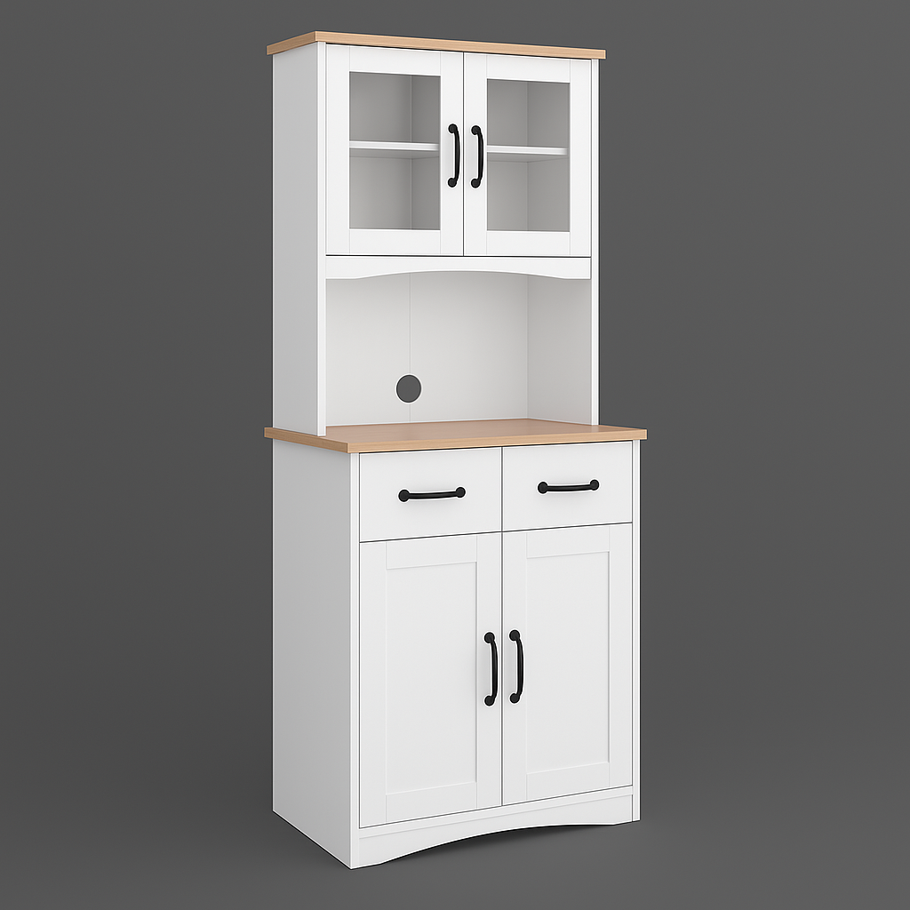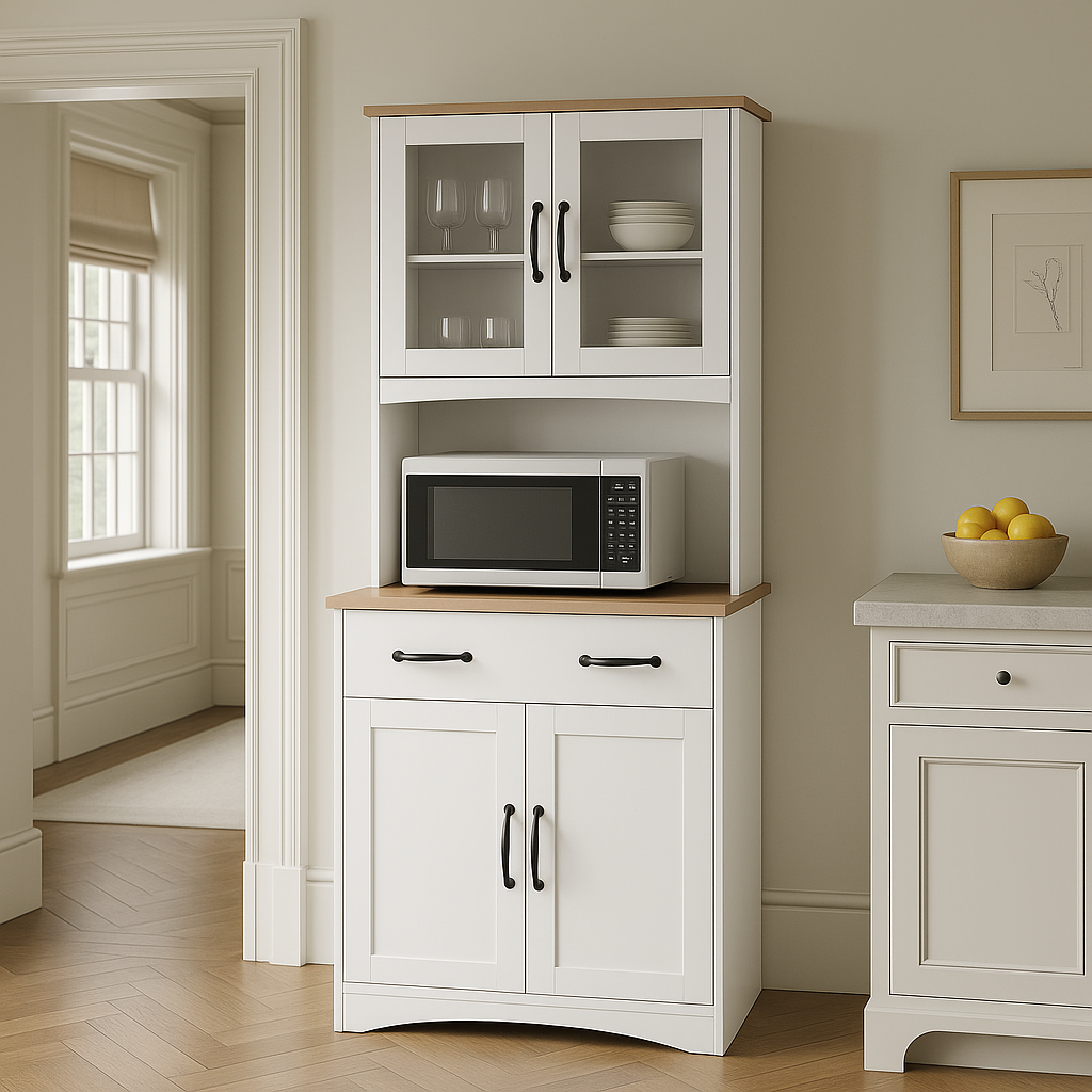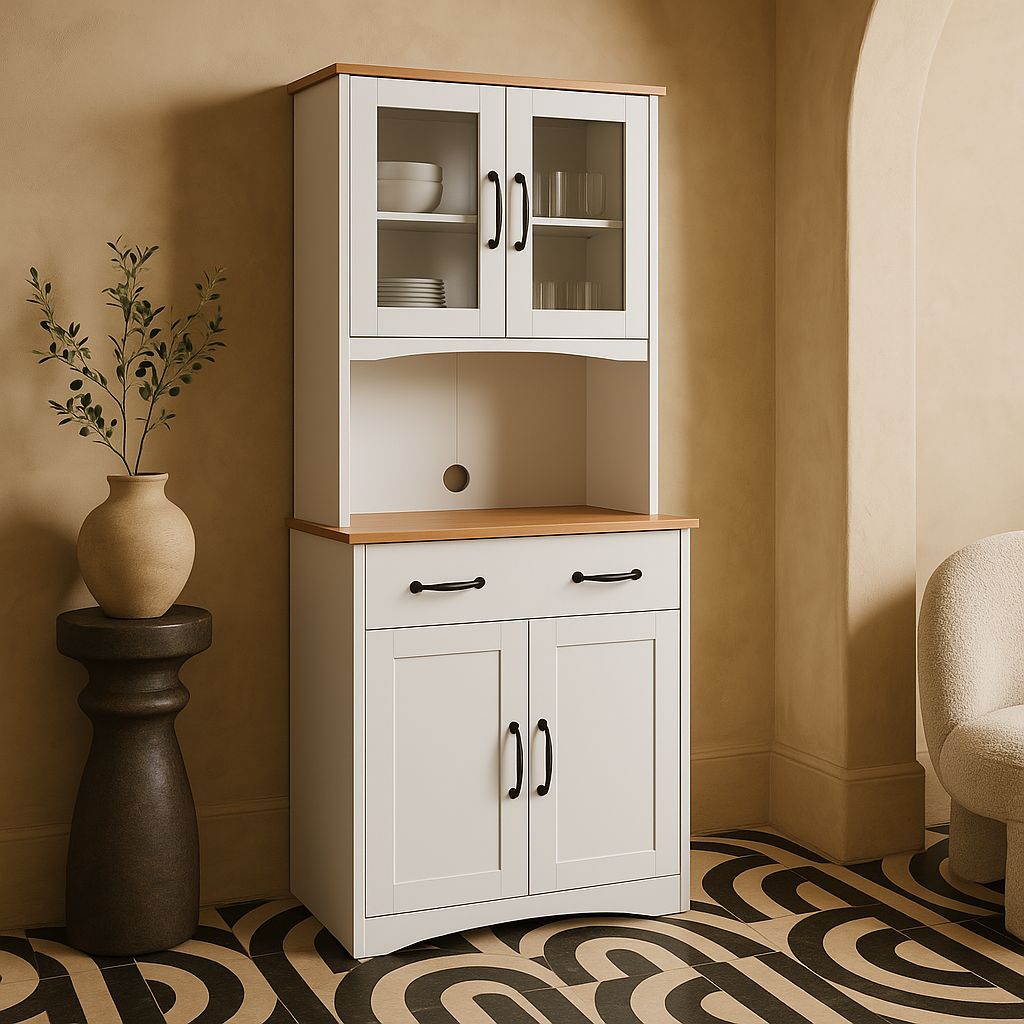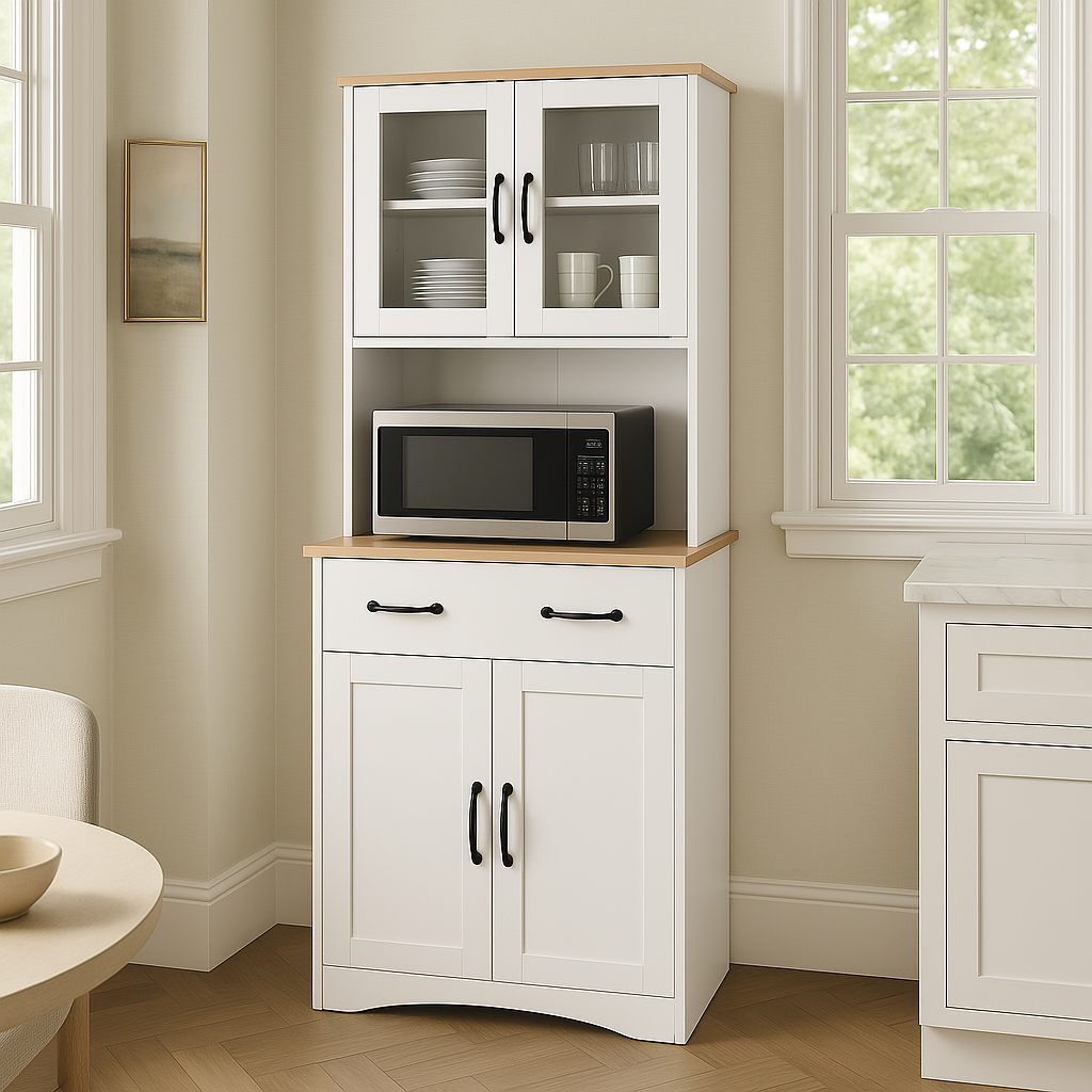 Transform your kitchen with the Aoibox pantry cabinet, a blend of functionality and elegance. Its painted white finish and wood-colored countertop add a touch of sophistication, while the adjustable shelves and glass doors provide versatile storage options. Style it with modern or farmhouse decor for a cohesive look. This cabinet is not just storage—it's a statement piece for your home.