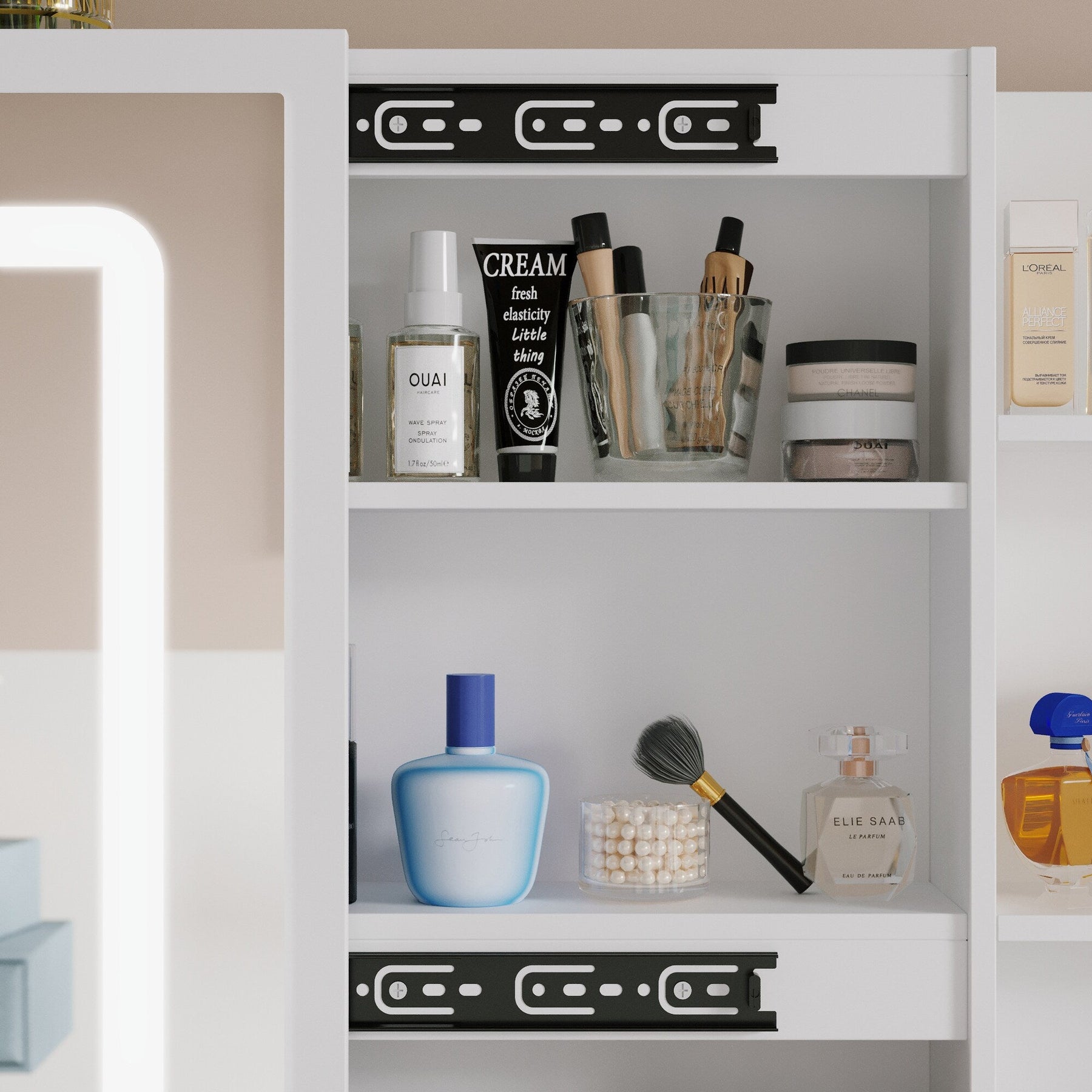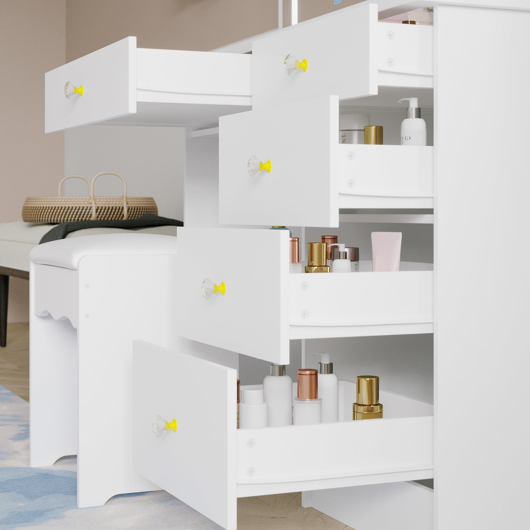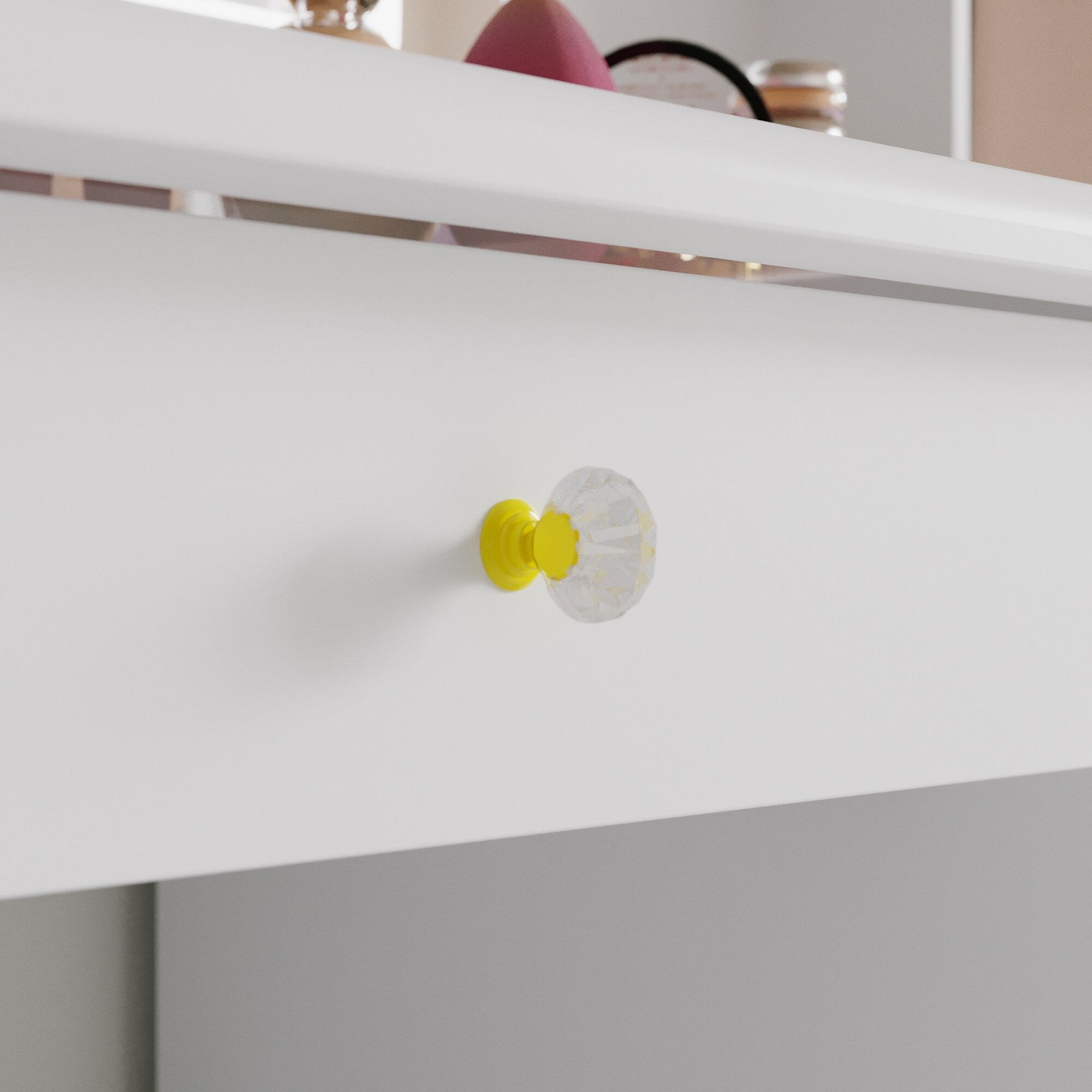 • Elegant Vanity Design: Features a refined matte white finish with gold crystal handle accents, perfect for adding sophistication to any space.