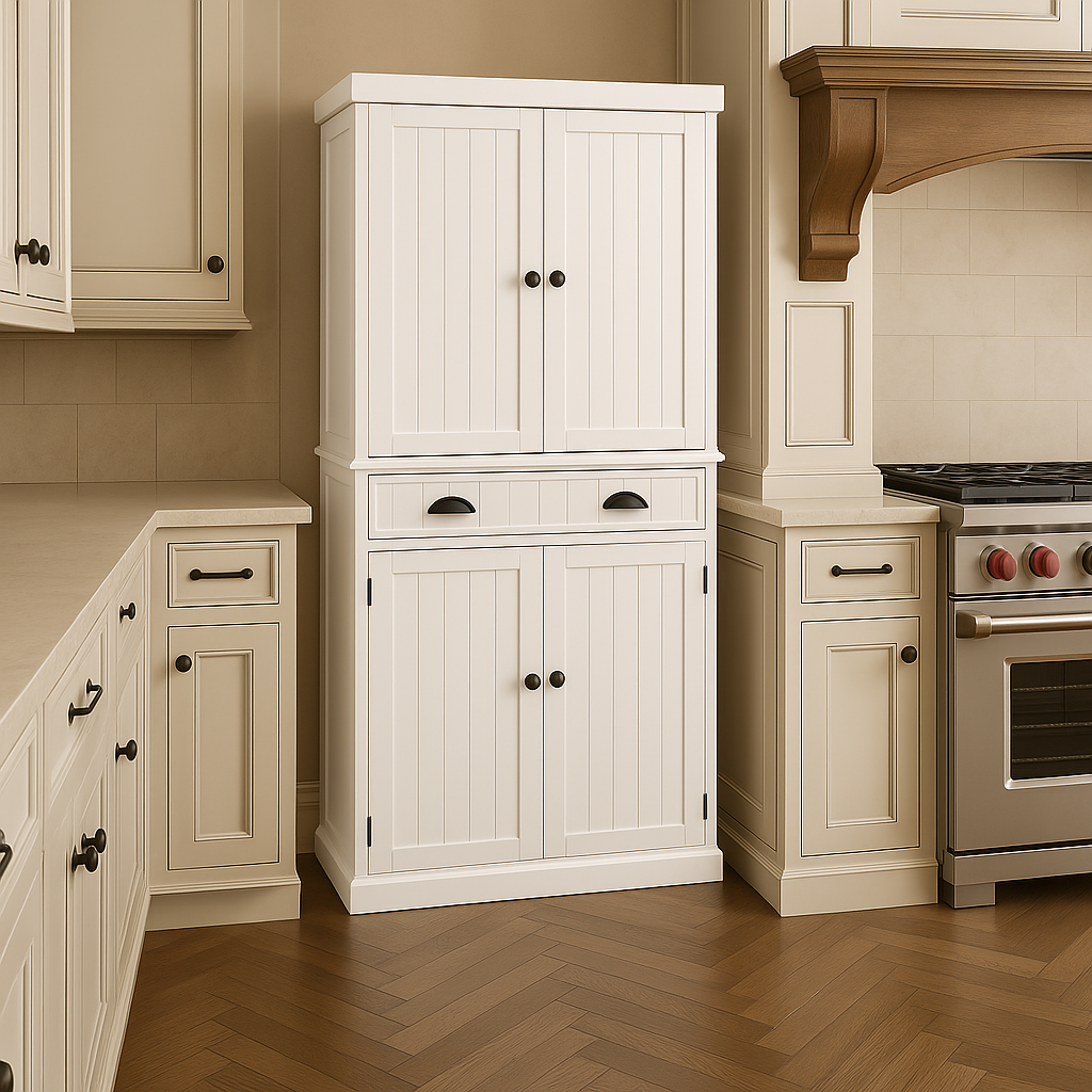The FUNKOL White Vertical Striped MDF Kitchen Cabinet combines style and functionality, featuring adjustable shelves, a durable MDF construction, and a painted finish. Perfect for organizing your kitchen or other spaces, it offers ample storage with a modern design.