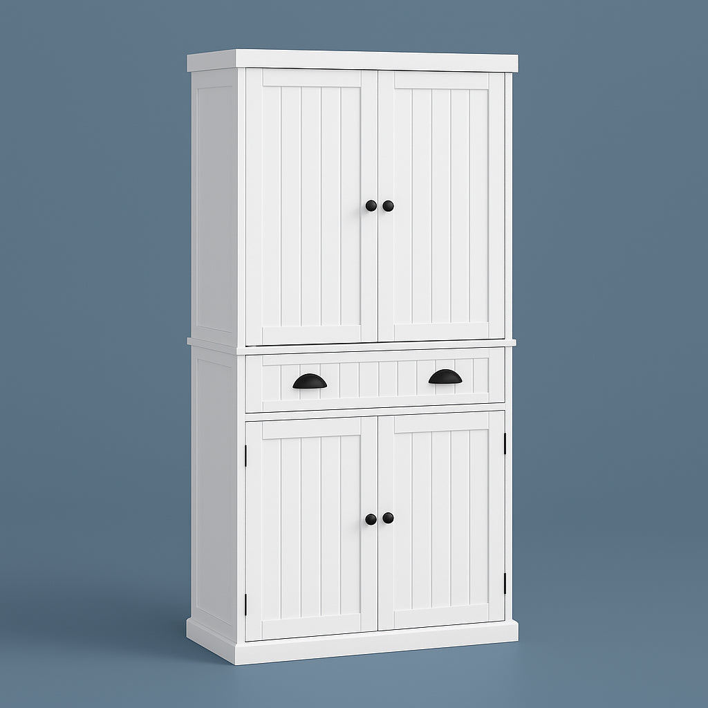 This cabinet is a masterpiece of modern design and practicality. Its white vertical stripes and vintage handles bring a touch of sophistication to any room, while the adjustable shelves offer versatile storage solutions. Place it in your kitchen or dining area to create a focal point that combines style and utility. With its eco-friendly finish and sturdy construction, this cabinet is not just a storage solution but a statement of refined taste.