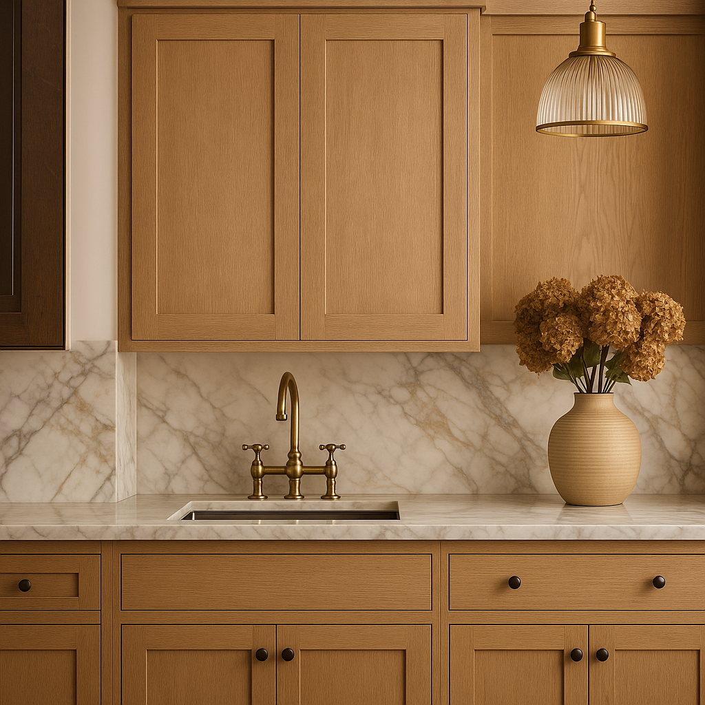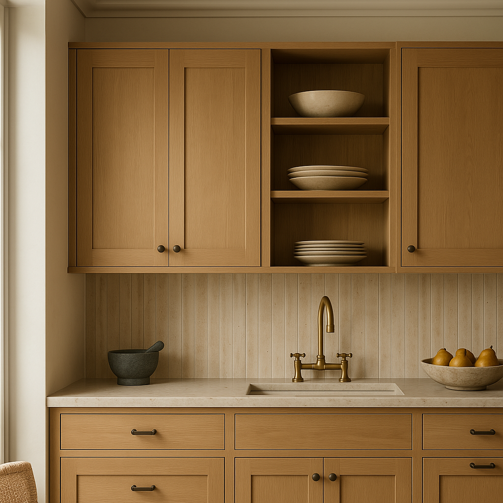 - Timeless Design: Shaker-style doors with a white oak finish.