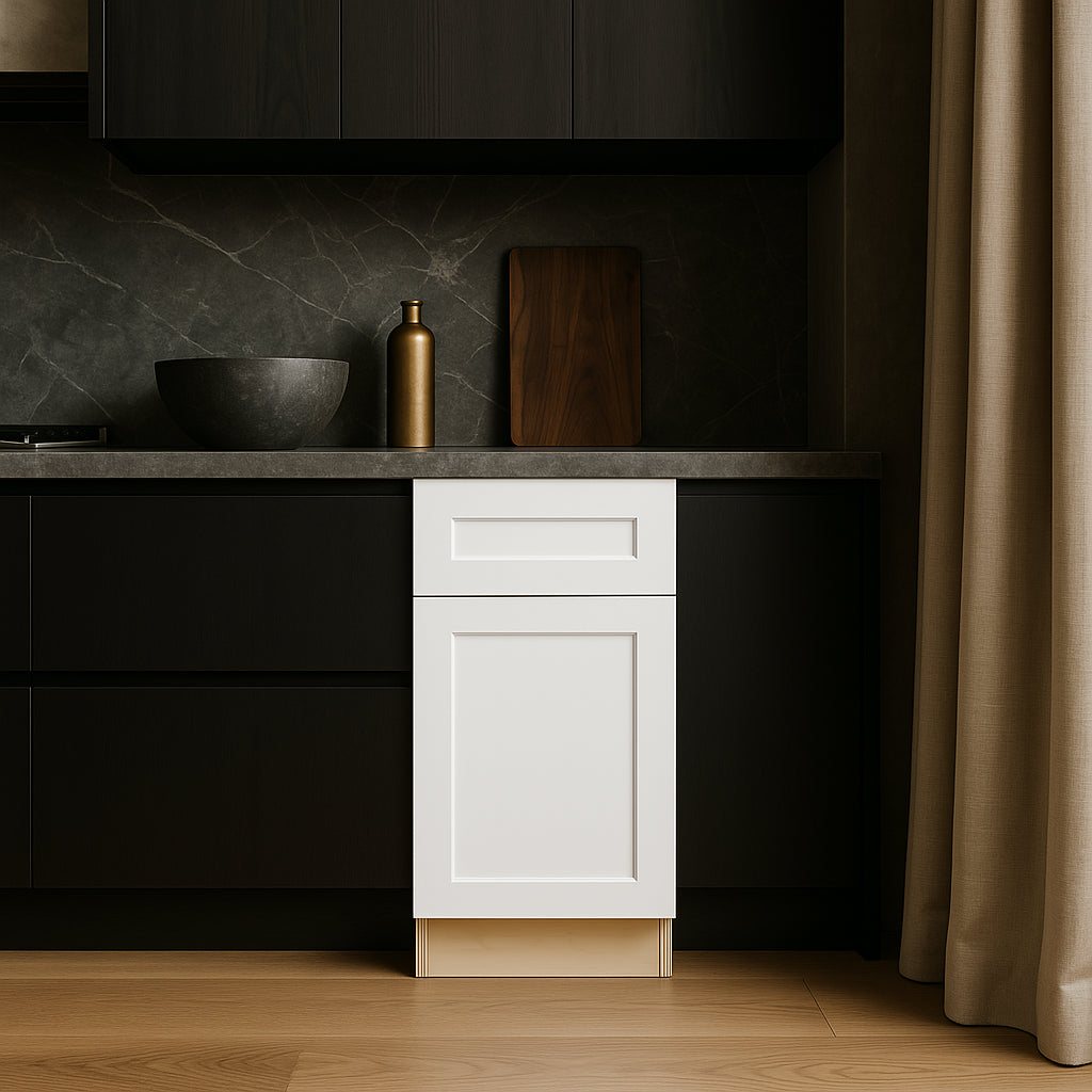 The Newport Base Cabinet in Pacific White combines timeless shaker-style design with modern functionality. Made with durable CARB II compliant plywood, it features soft-close doors and drawers, adjustable shelving, and a scuff-resistant painted finish.