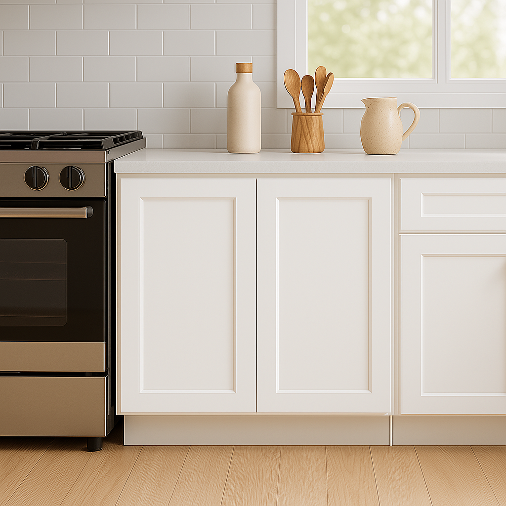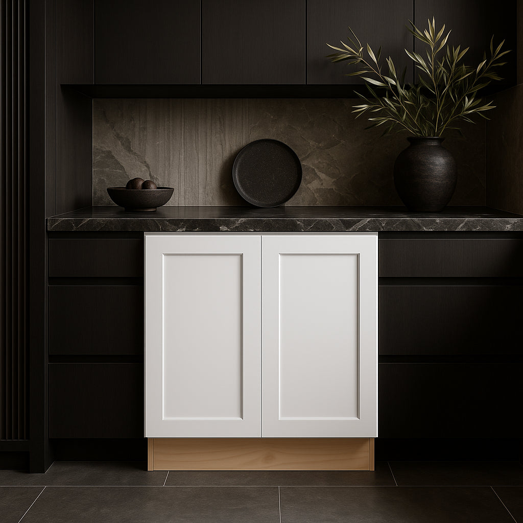 The Newport Base Kitchen Cabinet in Pacific White combines modern shaker-style design with durable plywood construction. Featuring adjustable shelves and a scuff-resistant finish, it offers both style and practicality for a well-organized kitchen.